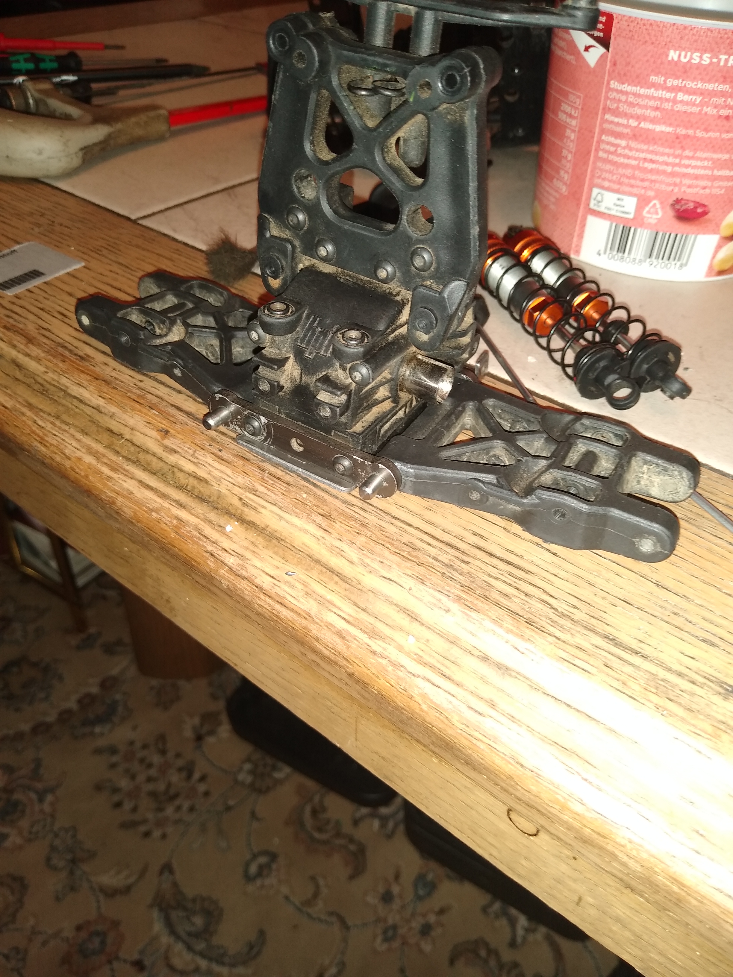 Als erstes hab ich mich Mal um die ausgeschlagen Querlenker und Querlenkeraufhängung gekümmert. Die waren nur noch mit Aufbohren(Aufreiben) auf 4mm Querlenkerachsen zu retten. Richtige Gleitlager hab ich aber an der Querlenkerachsen nicht unter bekommen. Wenn es auf Dauer nicht hält, werde ich mir ein paar neue Querlenkeraufhängungen aus dickere und breiteren Alu machen, in dann auch geschlitzte Gleitlager mit rein passen. Weil solche Stahlachsen mit der Zeit immer in dem Alu fressen.