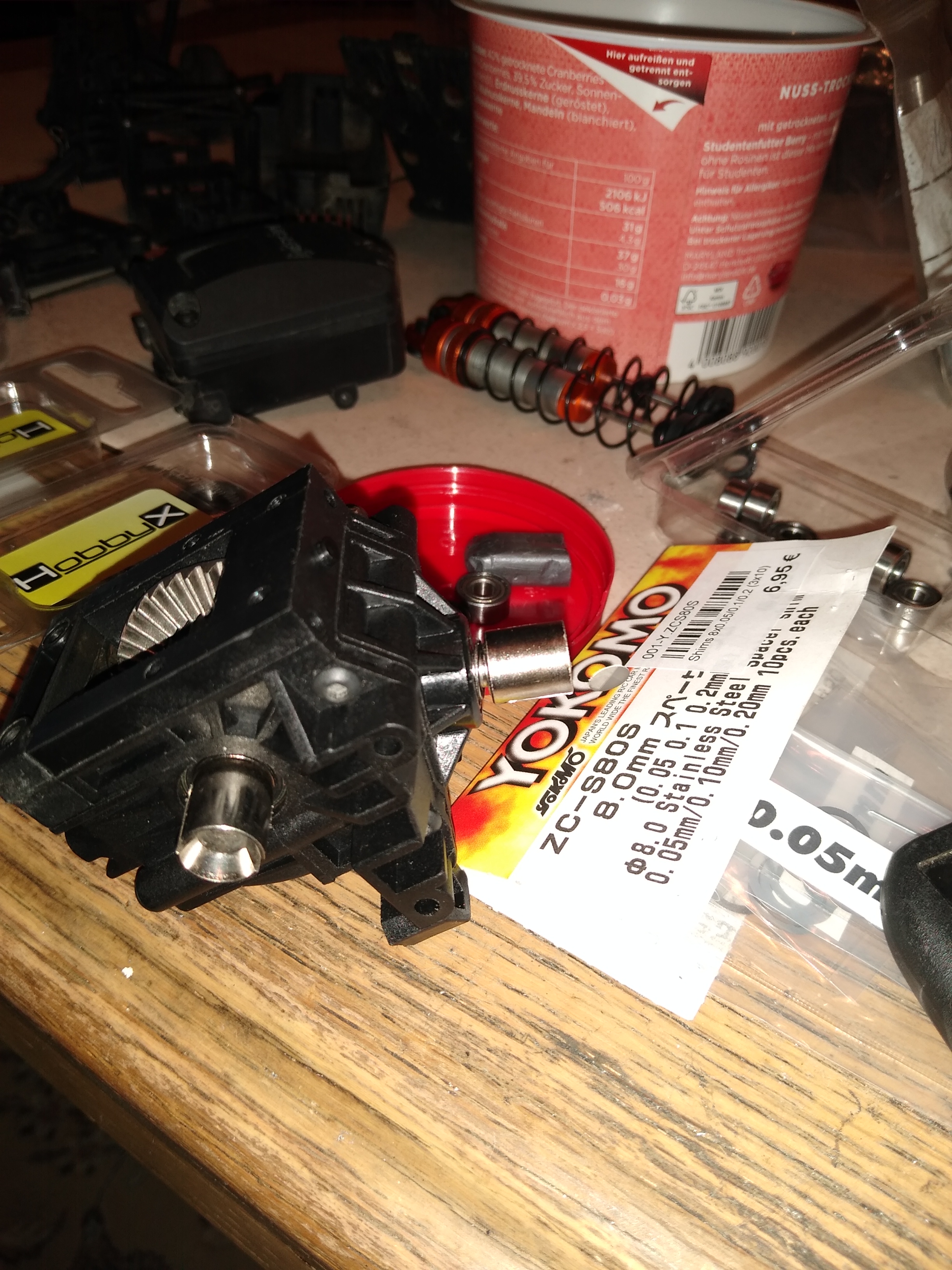 Da ich leider nur 2.5mm breite Distanzringe(Innenring von einem defekten 5x8x2.5mm Kugellager) in meiner Schrottkiste gefunden habe, muß ich die 0.5mm Überlänge mit 0.5mm ShimScheiben(yokomo 8x11mm) in den Lagersitzen ausgleichen. Sonst rutschen die beiden Achslager in ihren Lagersitzen hin und her.