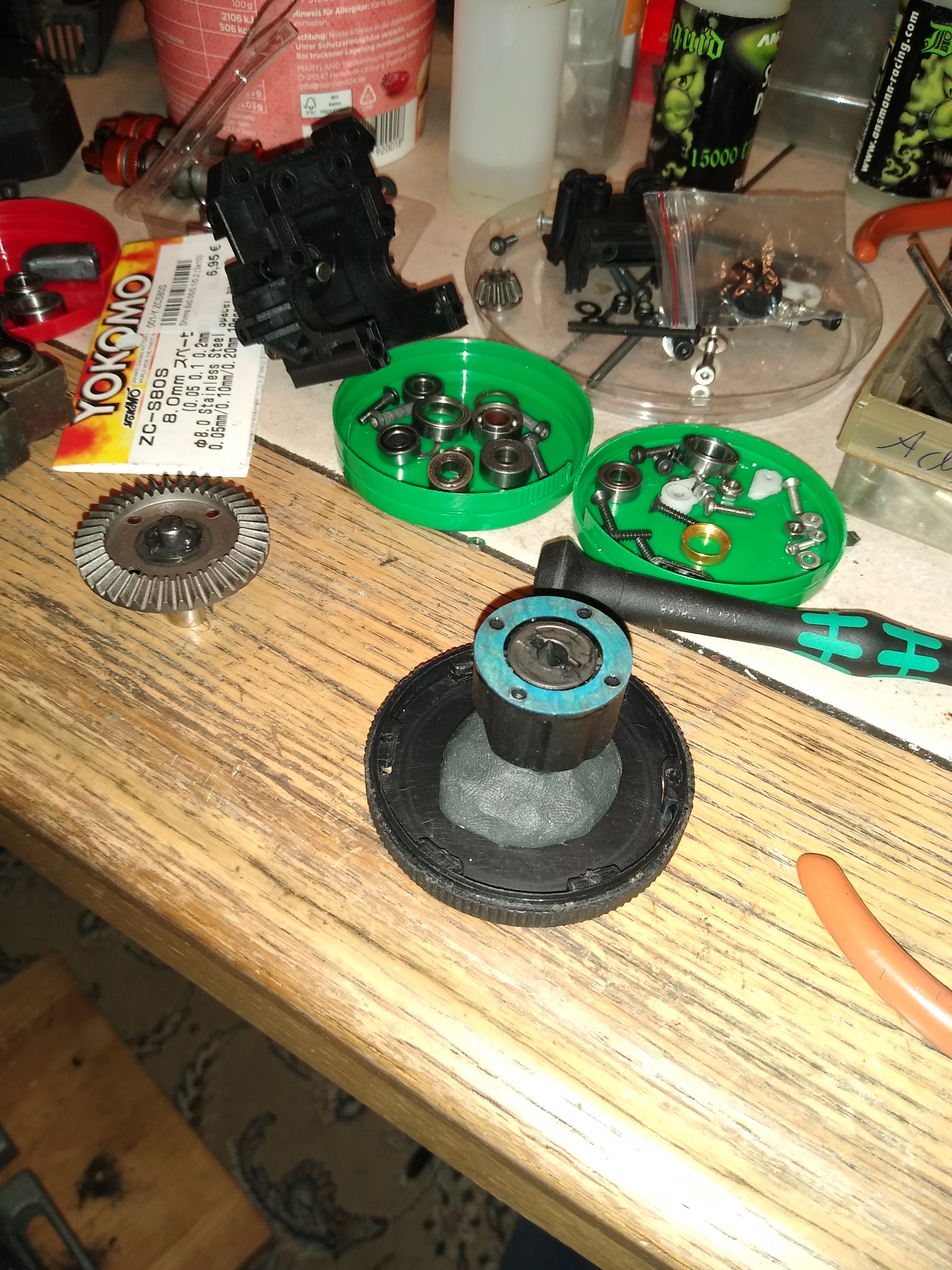 Heute hab ich Mal die hintere GetriebeBox und das Diff ausgewaschen, um es vernünftig shimen zu können. Das klebrige Hpi Schmierfett war nur mit "BenzinSeife" zu entfernen. Verschleiß war auf den Zahnflanken praktisch nicht zu erkennen. Nur ein ganz feiner Grad rings um das DiffKronRad war zu spüren.
