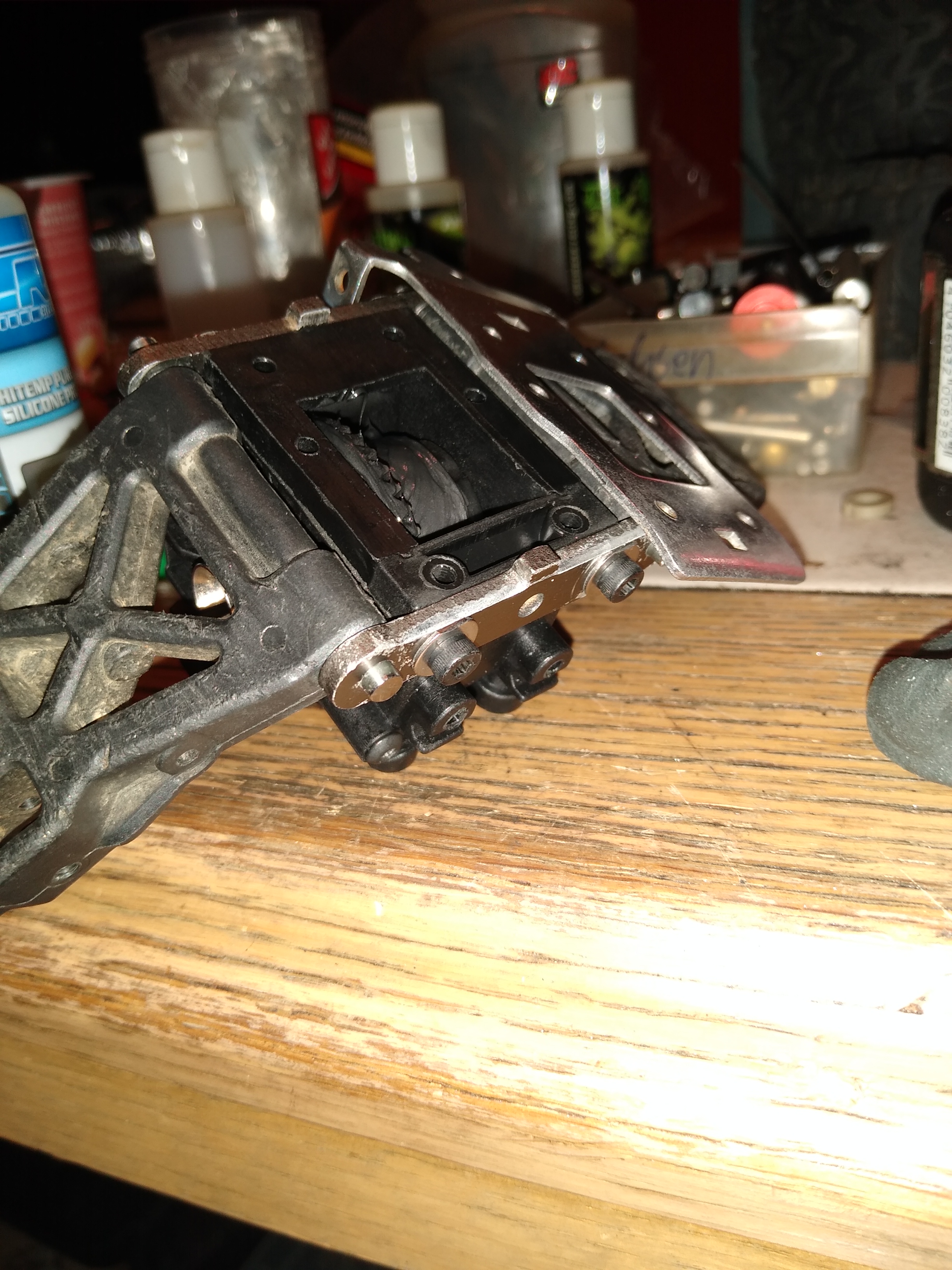 Dazu habe ich die Dämpfer angepasst(115mm Länge, Hub, Einfederweg Begrenzung). Ausserdem mußte ich die 0.5mm und 0.6mm ShimmScheiben an den Diffausgängen wieder entfernen, weil sich sonst die CVD bei dem erhöhten Einfederweg verspannen,verklemmen.