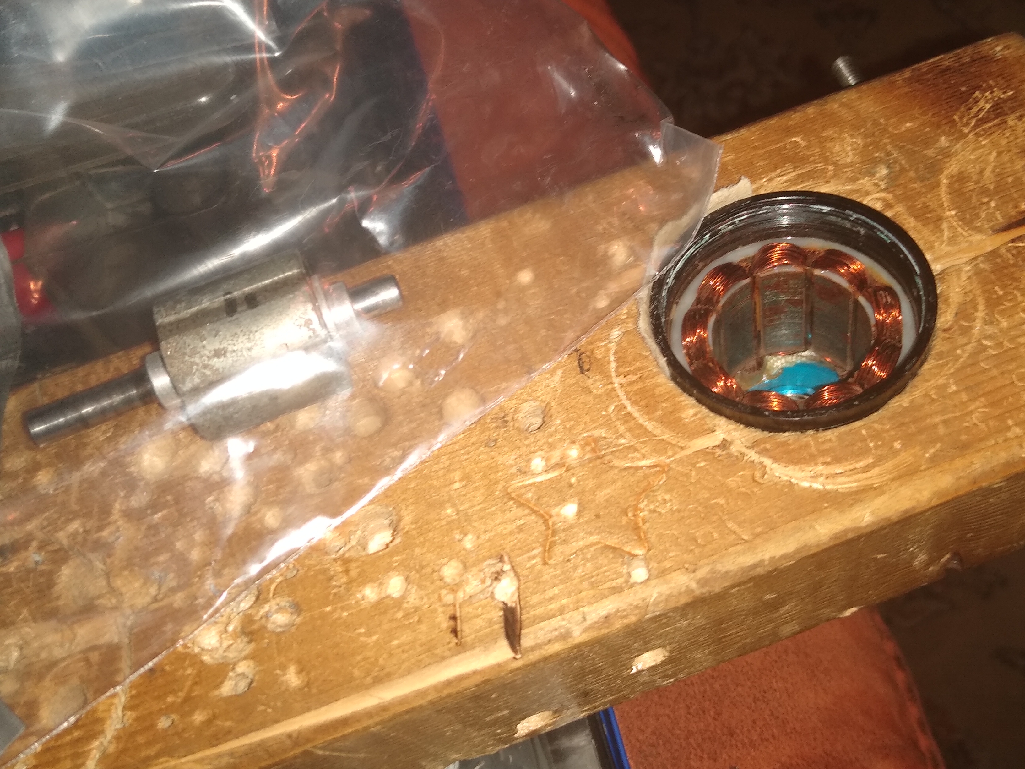 Die feinen Statorbleche und die Magneten auf dem Rotor sehen schon etwas mitgenommen aus(Oxidation). Aber der Motor ist auch schon über 10Jahre alt, und da kommt sowas schon Mal vor. Wahrscheinlich hab ich den Motor irgendwann Mal mit "schwitzigen" Händen zusammen montiert, und dann bleibt Oxidation halt nicht aus. Mittlerweile montiere ich den Rotor nicht mehr von Hand in das Motorgehäuse, sondern senke ihn in einem Bohrfutter eingespannt langsam in das Motorgehäuse ab, auch um das hintere Motorlager dabei nicht zu beschädigen.