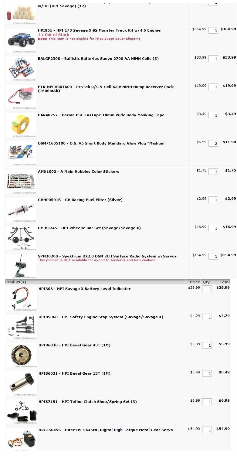 evtl. auch noch die akku-anzeige für die rc-box vom savage x, das safety motorstop-system und die hpi wheeliebar. als ersatzteile habe ich im moment nur ein 13t kegelrad, ein 43t tellerrad und ein set hpi-kupplungsbacken aus teflon.