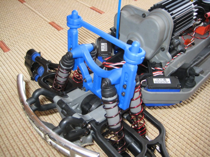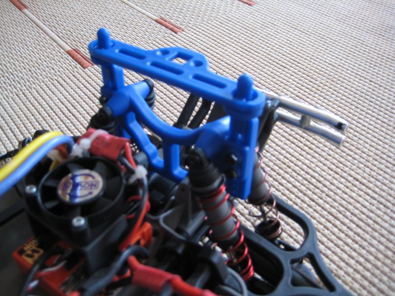 • Heute hat mich der Maxx dann auch mal überzeugt das er nicht das richtige Auto zum springen ist, denn heute ist bei einem Sprung dann die Hintere Dämpferbrücke gebrochen habe sie nun auch mal notdürftig mit Sekundenkleber und Kabelbindern fixiert. Werde dann bald wohl auf die RPM Dämpferbrücken wechseln wenn das Geld wieder einmal ein bisschen lockerer sitzt :thumbup:
