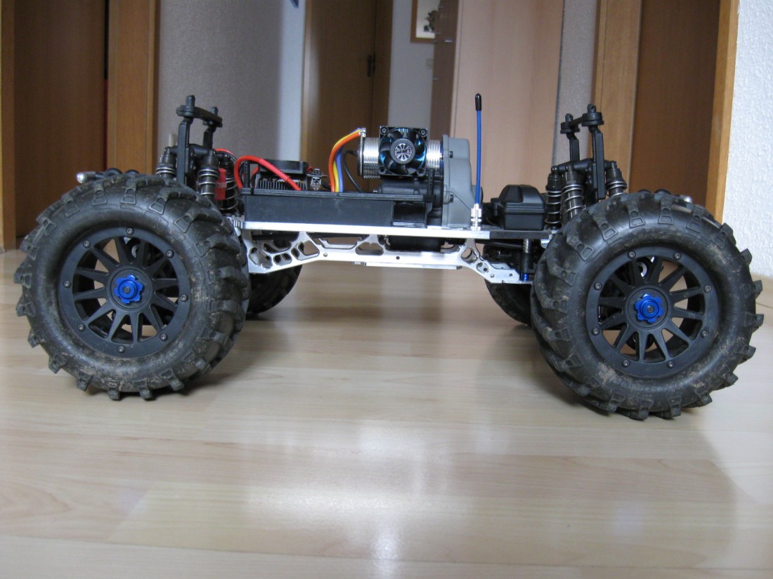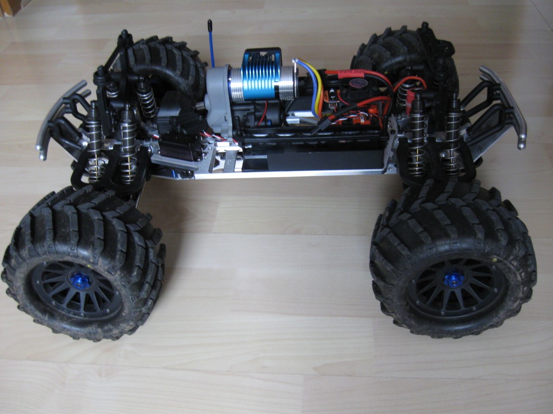 Ich denke das liegt größenteils am Alu-Chassis, den Beadlocks mit den Mashern und noch den kompletten Alu-Skids ![]()