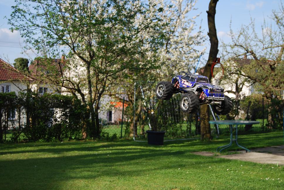 Die neue Stabilität war unglaublich und ich grinste über beide Backen beim fahren. Dann stellte ich im Garten eine Schanze auf, was erst recht Spaß machte. Drei bis vier Meter Sprungweite sind kein Problem ;) und ich hatte nie Schäden, trotz teilweiße derben Landungen auf einem Rad dank RPM und ALU xD. Dann wurde ich langsam immer sicherer mit dem Schanzen sodass ich einen frontflip probieren wollte ( springen und dann Vollbremsung im Flug) naja das hätte ich lieber gelassen: der maxx landete voll auf der hinteren Dämpferbrücke überschlug sich dreimal und wie nicht anders zu erwarten war brach die Dämpferbrücke ( Das scheint beim Maxx ja eine Krankheit zu sein). Zuerst sicherte ich sie mit Kabelbindern, was aber nicht lange hielt. Dann endlich kam die neue Dämpferbrücke aus Alu und gleich noch ein Überrollbügel aus Chromstahl und ich sollte diesen Kauf (bei gpracing) nicht bereuen. Das Gewicht hält sich in Grenzen und mit meinen 7 Zellern und dem Ultramat 16 ließ sich da auch einiges an Geschwindigkeit und Wheelies machen :D . Doch die Freude hielt nicht lange. Nach ein paar Fahrten voller Wheelies gingen meine Motoren flöten.