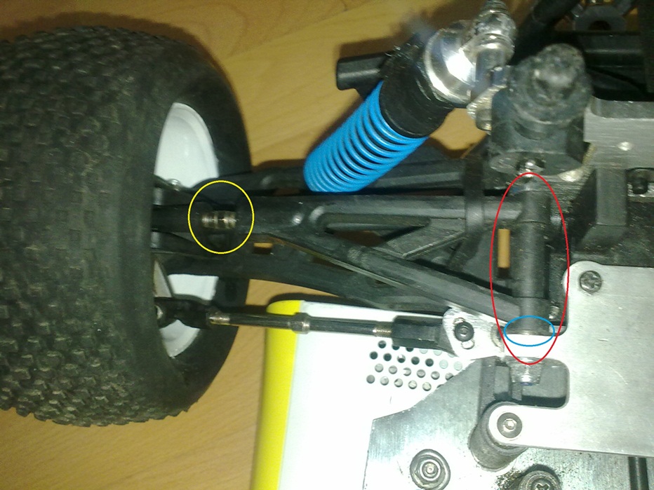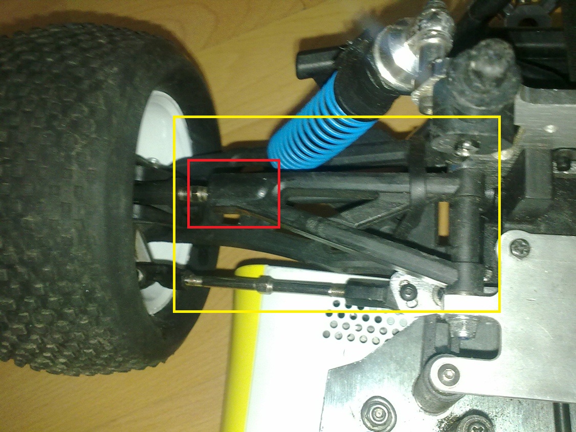 Den Querlenker (Gelb Markiert)will ich evt Wechseln da im Rot gekenzeichnetem Bereich mir gut und gerne mal der Querlänker ausschlägt,jetzt dachte ich mir hinten ist es z.B nir ein gestänge und das hebt Bombatist und so evt auch vorne hin bauen alos so wie beim Ansmann Hogzilla,siehe bild