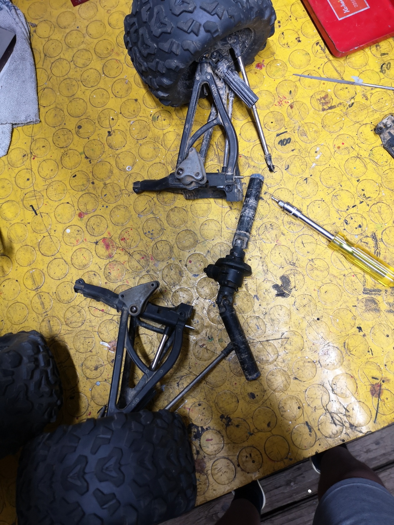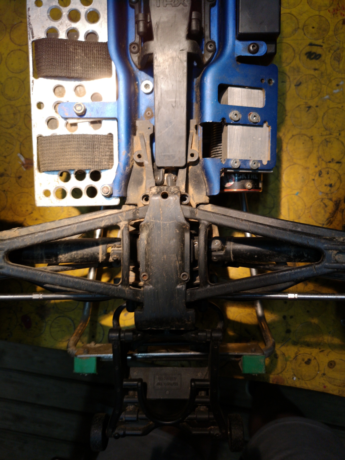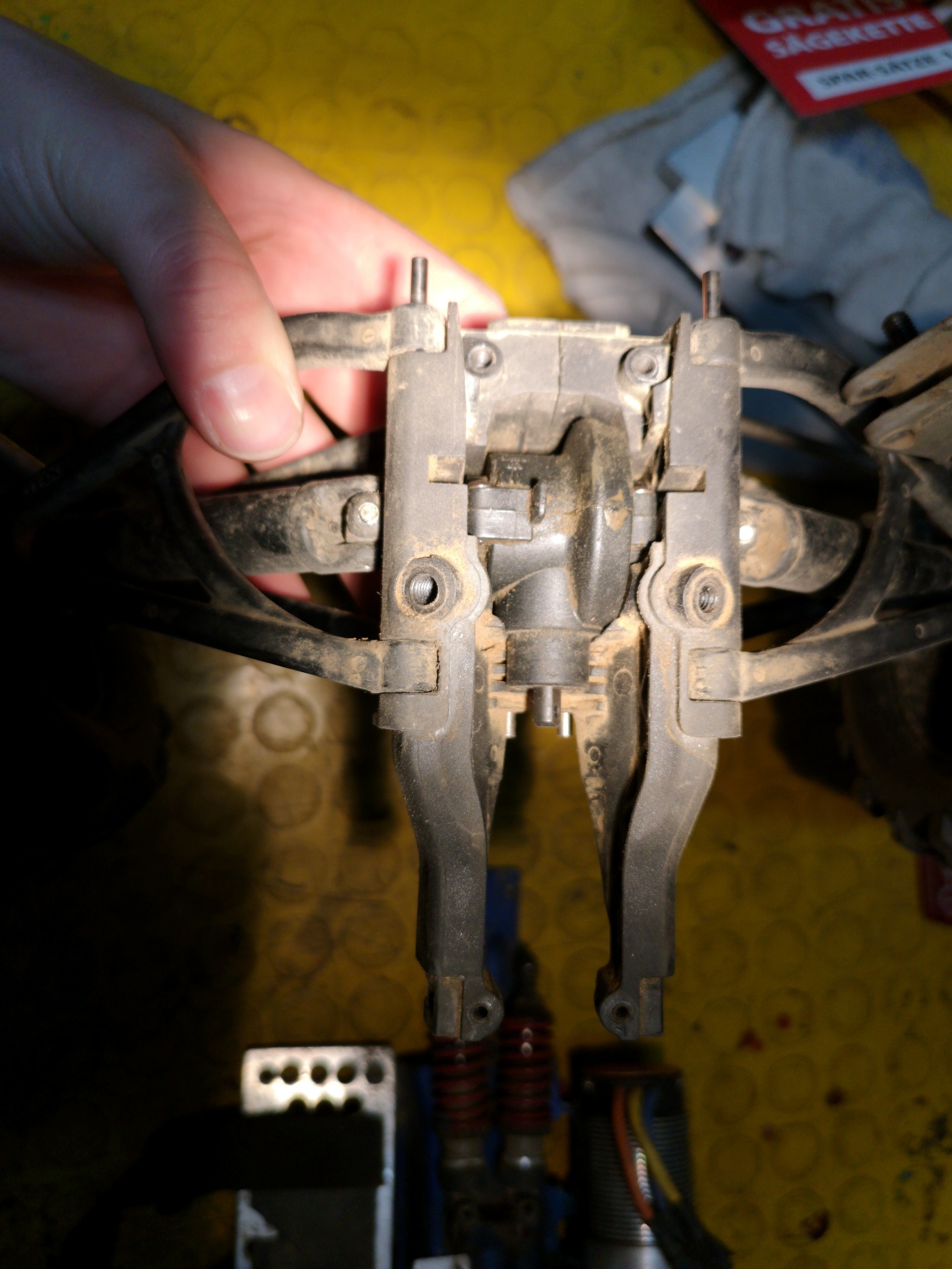 Anbei ein paar Bilder. Im Allgemeinen ist der Revo eher in einem Wartungsbedürftigen Zustand. Viele Kugelköpfe sind ausgeschlagen und was die Kugellager machen weiß ich auch nicht. Manschetten der Antriebswellen sind ebenfalls nicht mehr vorhanden oder halb abgerissen. Die braucht man aber eh ned wirklich.