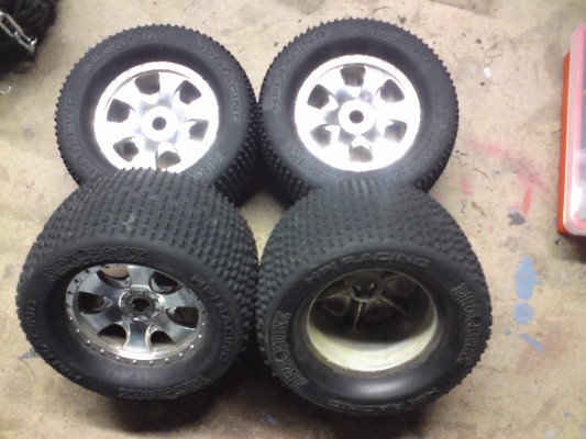 Zur Zeit fahre ich die Orginal Mitnehmer mit E-Revo Reifen, es wird aber noch ein Satz mit Offroad Reifen folgen (Am besten natürlich mit schwarzen Felgen