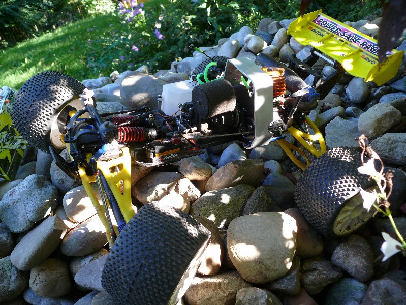 Die Rocker (Umlenkhebel) sind aus Alu von RD Logics. Die Dämpfer haben GTR beschichtete Gehäuse und vorne orange und hinten grüne federn. Sie sind mit 50er Öl befüllt, das ist mit den Federn nicht zu straff, aber auch nicht sehr weich.