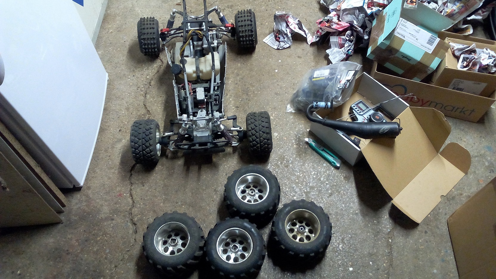 Achso, mit den Monsterreifen, ohne Karo und mit leerem Tank wiegt der gesamte Truck gute 10,8kg. Will man auf Brushless umbauen, dann kann man den Tank entnehmen und kann mit 10,5kg Gewicht starten. Dazu kämen dann nochmal gut 3,5-4kg Brushless und Elektrik und dann wäre man am Ende bei guten 14-14,5kg Kampfgewicht fahrbereit.