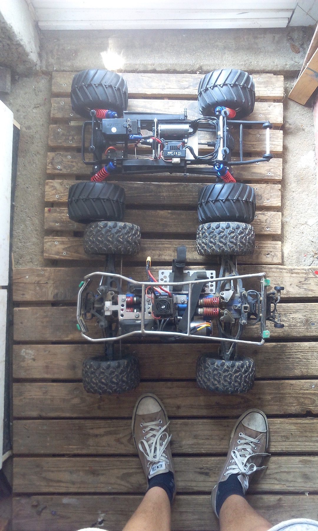Wiegt mit Karo und ohne Akku ziemlich genau 3,9kg. Wird wohl ein gutes Stück leichter als der Revo. Da das Getriebe in der Mitte komplett rausfällt wird da auch ned so schnell was verecken.