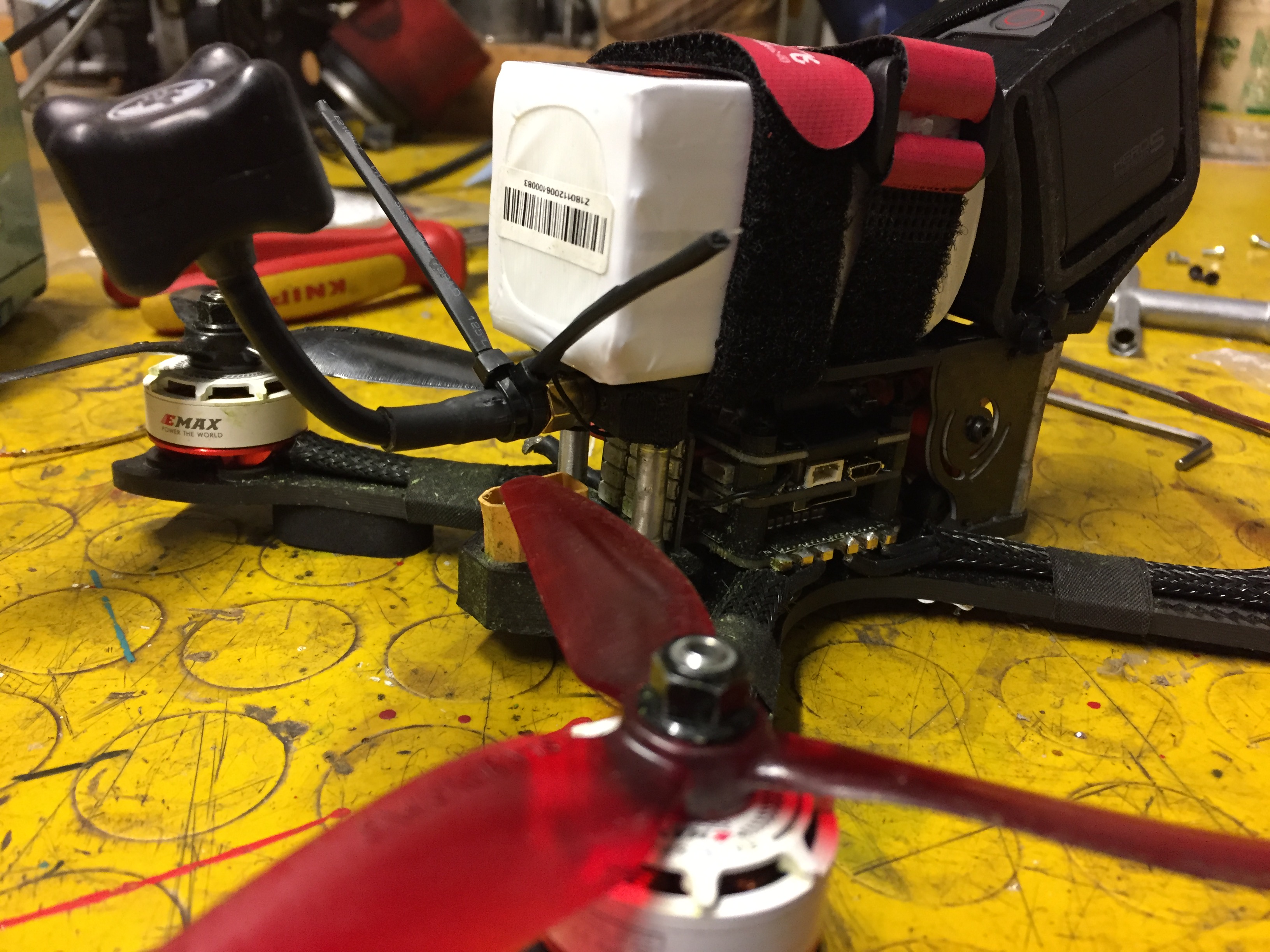 Motoren wurden auf Softmounts gesetzt und Massekabel der Kamera wurde auf den FC gelötet, damit das BIld streifenfrei bleibt.