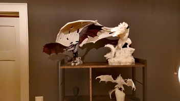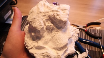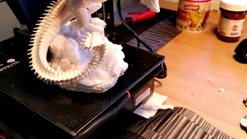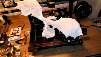 Bis jetzt sind ca. 350h reine Druckzeit reingeflossen und der gesamte Drache wird nochmal 250h Druckzeit verschlingen.