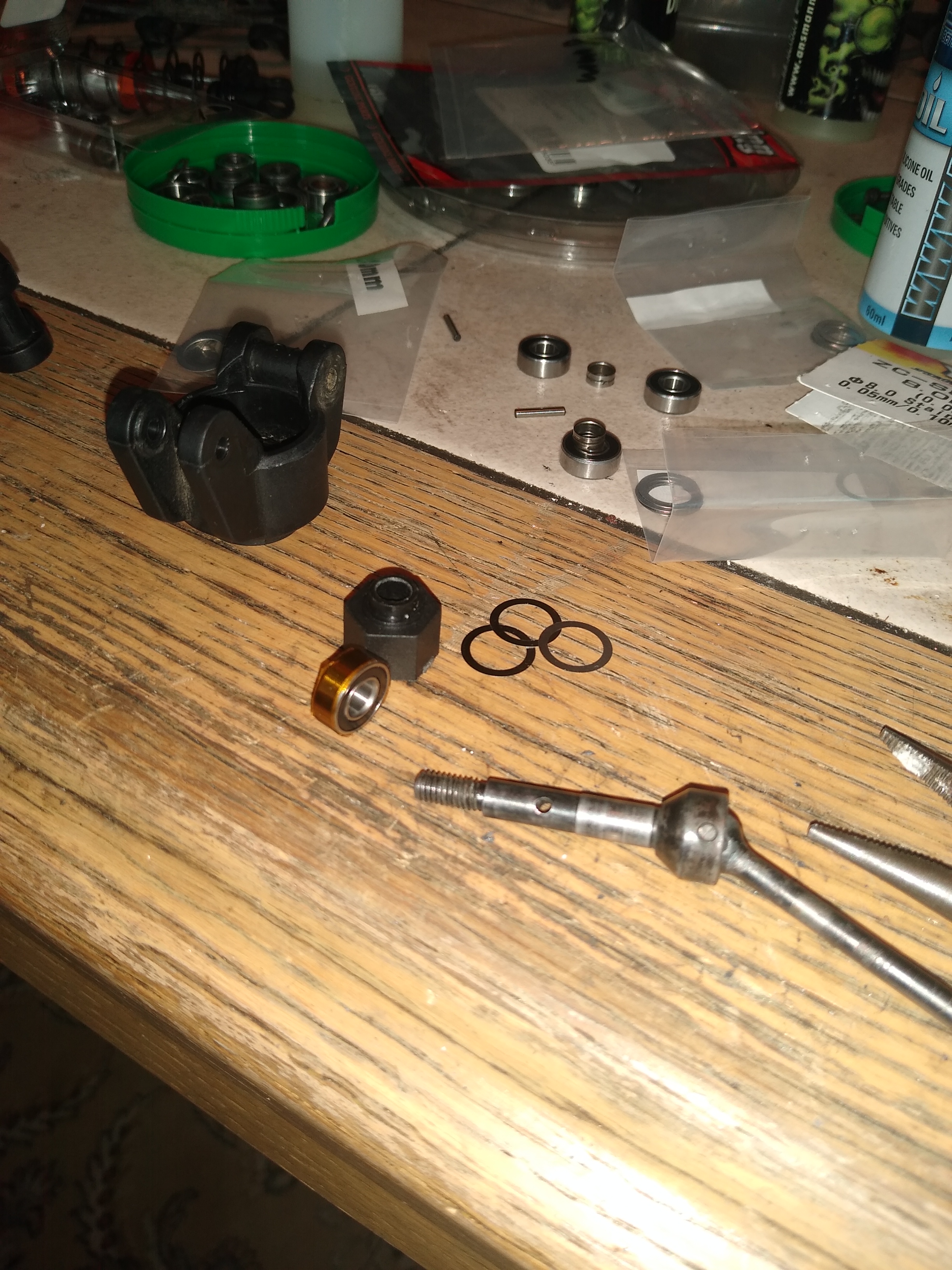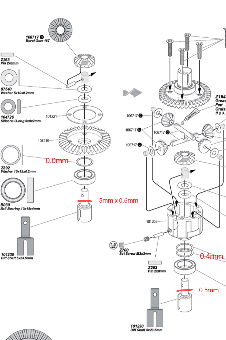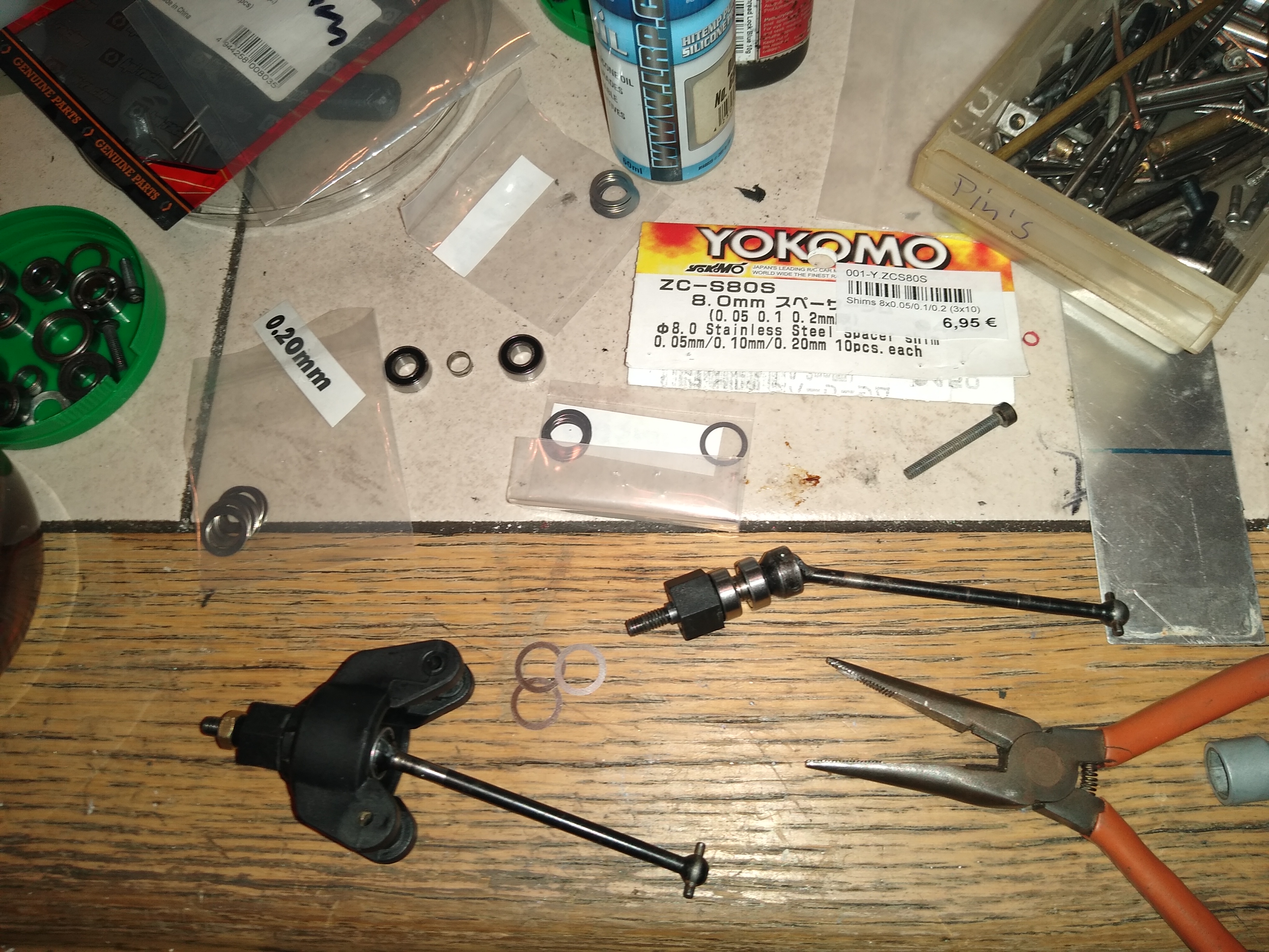 Da ich leider nur 2.5mm breite Distanzringe(Innenring von einem defekten 5x8x2.5mm Kugellager) in meiner Schrottkiste gefunden habe, muß ich die 0.5mm Überlänge mit 0.5mm ShimScheiben(yokomo 8x11mm) in den Lagersitzen ausgleichen. Sonst rutschen die beiden Achslager in ihren Lagersitzen hin und her.