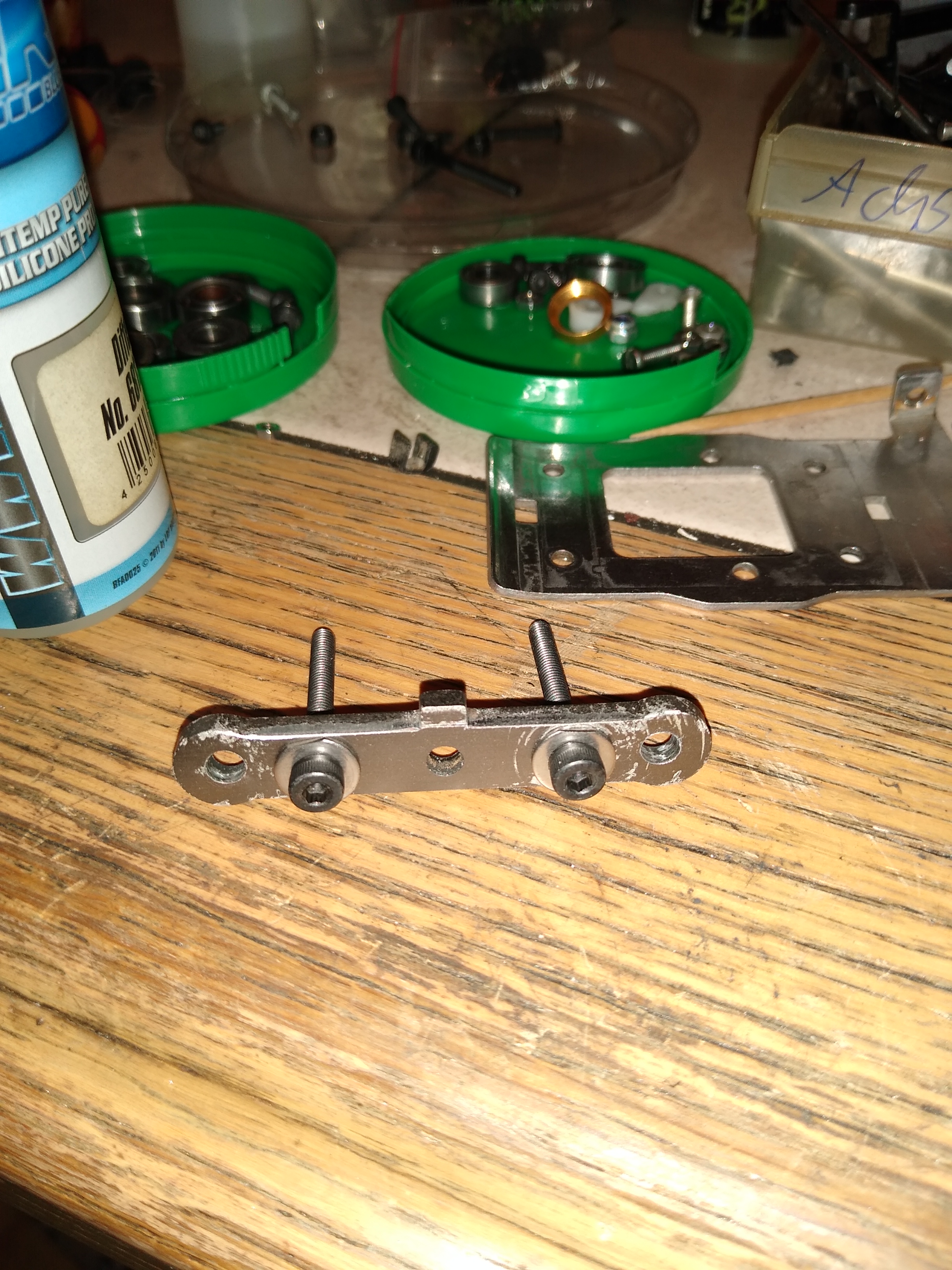 Als erstes hab ich mich Mal um die ausgeschlagen Querlenker und Querlenkeraufhängung gekümmert. Die waren nur noch mit Aufbohren(Aufreiben) auf 4mm Querlenkerachsen zu retten. Richtige Gleitlager hab ich aber an der Querlenkerachsen nicht unter bekommen. Wenn es auf Dauer nicht hält, werde ich mir ein paar neue Querlenkeraufhängungen aus dickere und breiteren Alu machen, in dann auch geschlitzte Gleitlager mit rein passen. Weil solche Stahlachsen mit der Zeit immer in dem Alu fressen.