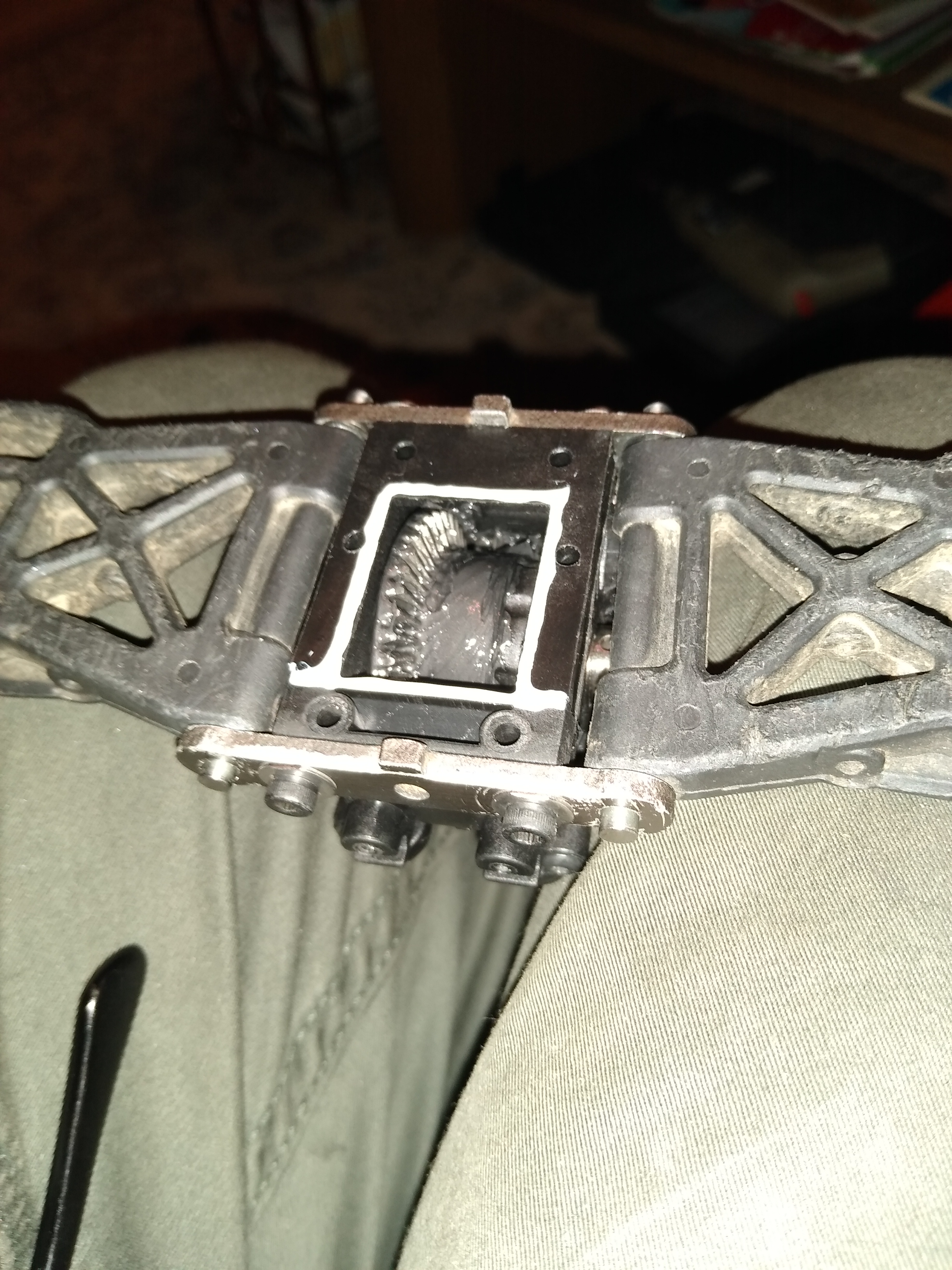 Heute hab ich Mal die hintere GetriebeBox und das Diff ausgewaschen, um es vernünftig shimen zu können. Das klebrige Hpi Schmierfett war nur mit "BenzinSeife" zu entfernen. Verschleiß war auf den Zahnflanken praktisch nicht zu erkennen. Nur ein ganz feiner Grad rings um das DiffKronRad war zu spüren.