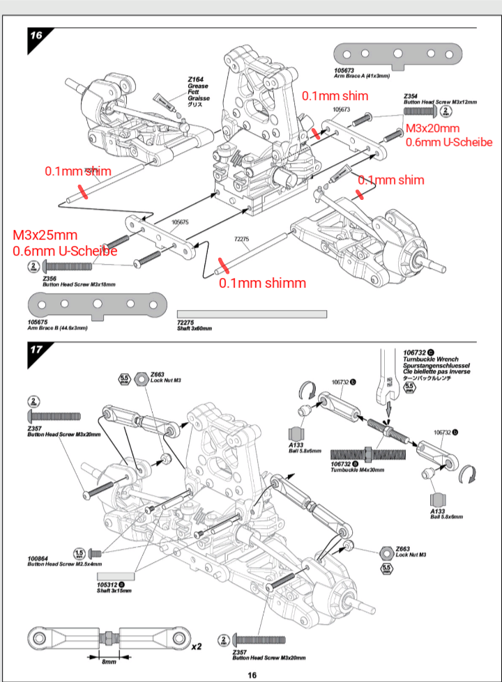 Die hintere Querlenkerhalterung(Arm brace B) habe ich etwas angephast, damit das Bodenblech(105679) auf der Getriebebox richtig aufliegen kann. An den Arm brace habe ich mit etwas längeren Schrauben und dicke U-Scheiben verwendet. Die 0.1mm ShimmScheiben auf den Querlenkerachsen reduzieren die Reibung, und verhindern das sich die Querlenker und die Arm brace fressen. Das bezi-zell auf der Getriebebox dient als Dichtung.