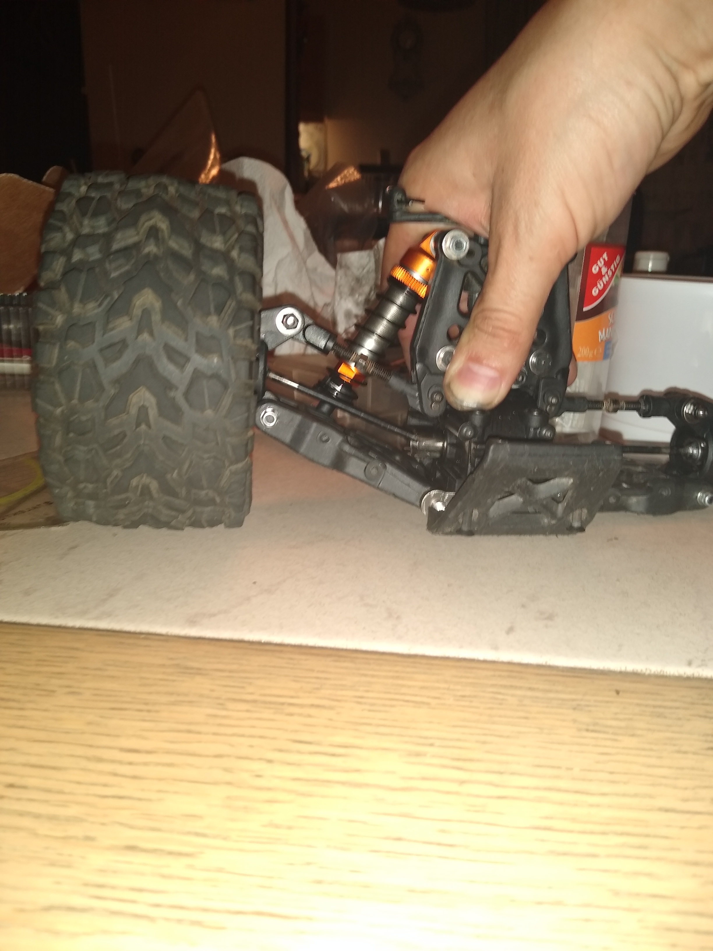 Dazu habe ich die Dämpfer angepasst(115mm Länge, Hub, Einfederweg Begrenzung). Ausserdem mußte ich die 0.5mm und 0.6mm ShimmScheiben an den Diffausgängen wieder entfernen, weil sich sonst die CVD bei dem erhöhten Einfederweg verspannen,verklemmen.