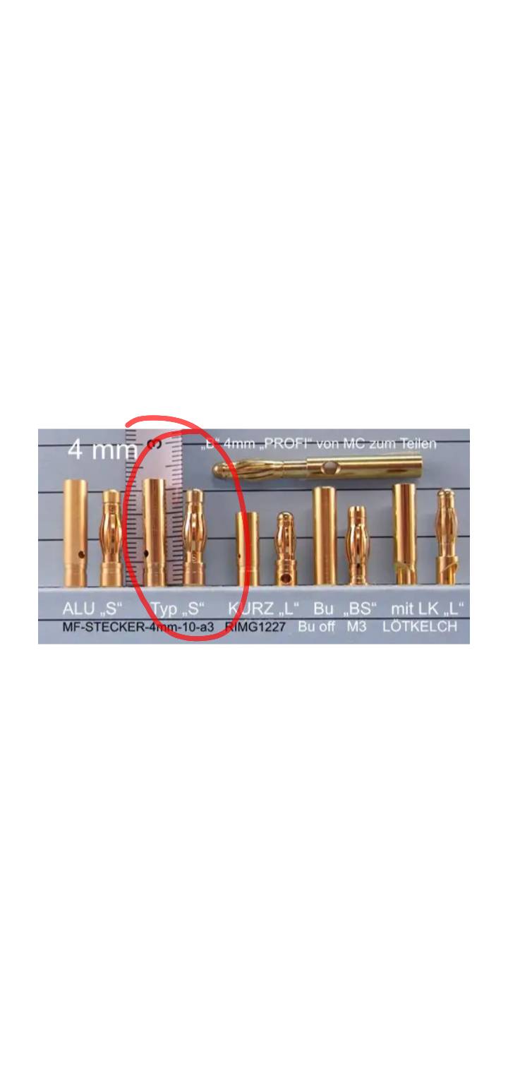 • Meine überall Akkustecker sind auch kurze 6mm Schlitzkontakte(Nessel-Elektronik). Die sind kompakt, haben durch ihre geringe Länge gute Federkraft, sind sehr passgenau, und somit bis 80A Dauer/ 160A Peak verwendbar. Die kommen bei mir möglichst überall zum Einsatz, selbst wenn sie manchmal völlig unterlastet sind. So spare ich mir halt einen Haufen unterschiedliche Ladekabel. Da ich in der Regel mehrere Akkus parallel an einem Ladeausgang auflade, ist das Verwenden von nur einem Akkustecker Typ letztlich auch günstiger.
