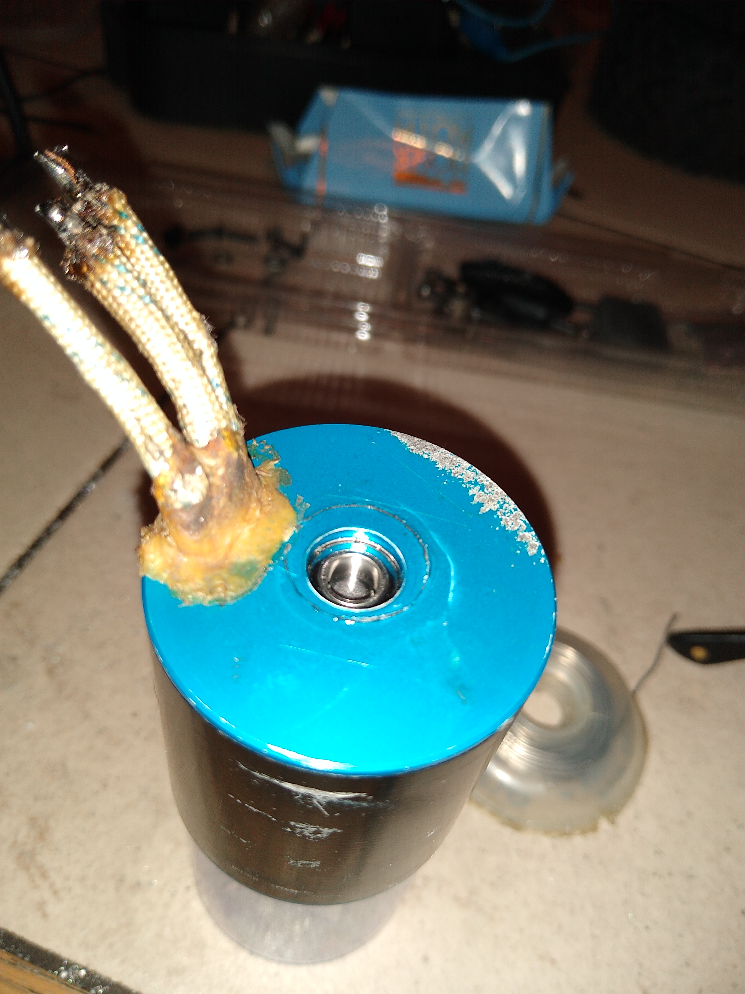 • Die Verklebung zwischen Motorwelle und Rotorkörper hat sich gelöst, und die Motorwelle ist dann langsam mit dem Ritzel zusammen nach vorne aus dem Motorgehäuse rausgewandert. Gott sei Dank hab ich es noch früh genug bemerkt, kurz bevor die Motorwelle ganz aus dem hinteren Motorlager gerutscht ist. Sonst hätte es den Rotor mit Sicherheit völlig zerschlagen. Die Lager scheinen keinen Schaden genommen zu haben.