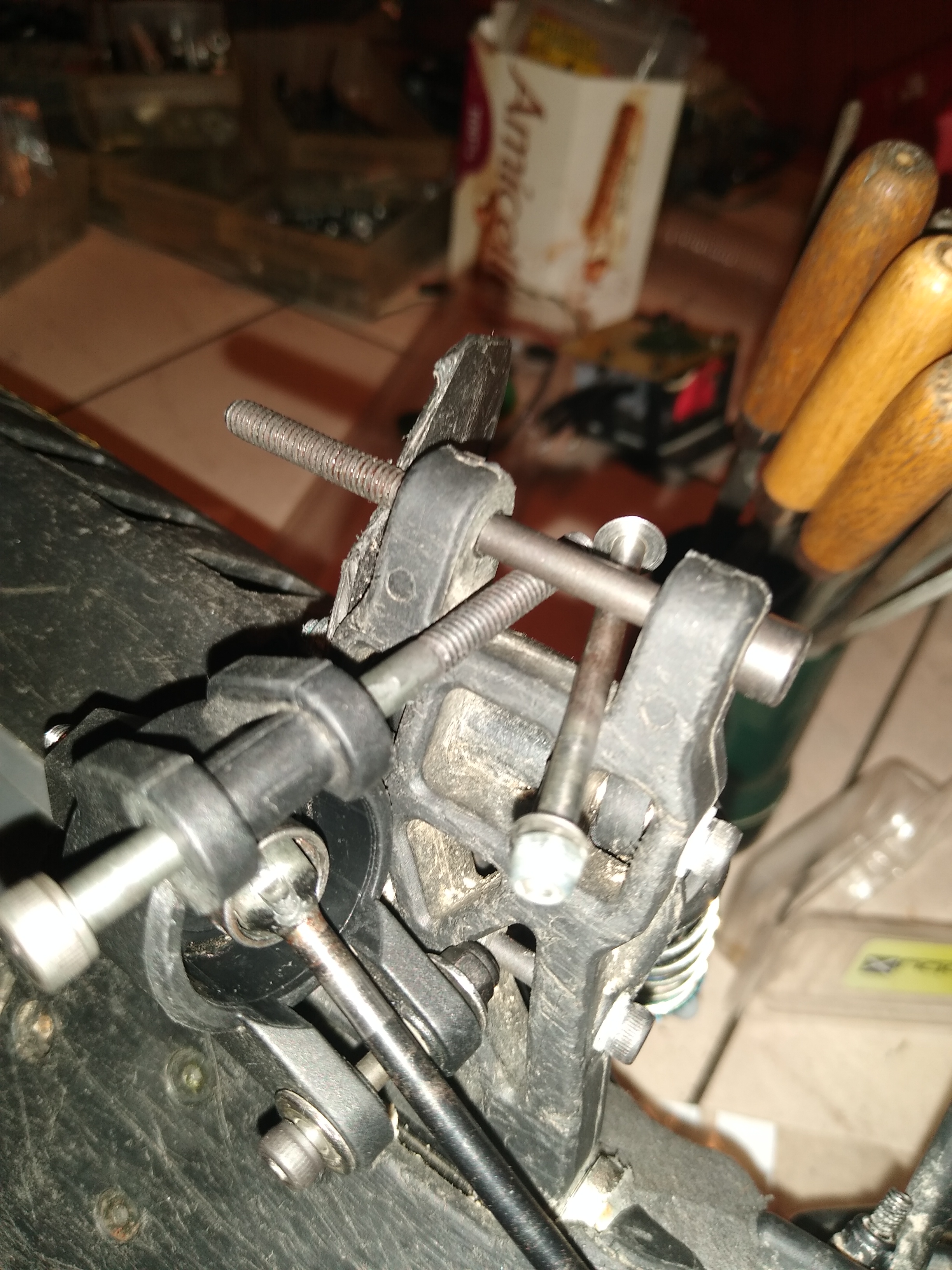 • Die "Kugelpfannen" dürfen halt nicht mehr als 10mm Aussendurchmesser haben, damit sie sich nicht verklemmen. Das begrenzt die Auswahl deutlich. Also kann ich es nur mit dickeren Kugelpfannen versuchen. Aktuell habe ich 4mm dicke verbaut. Da der Bolzen aber nur 3mm Durchmesser hat, schlagen die Pfannen trotzdem relativ schnell aus. Bolzen mit mehr Durchmesser kann ich leider nicht verwenden.