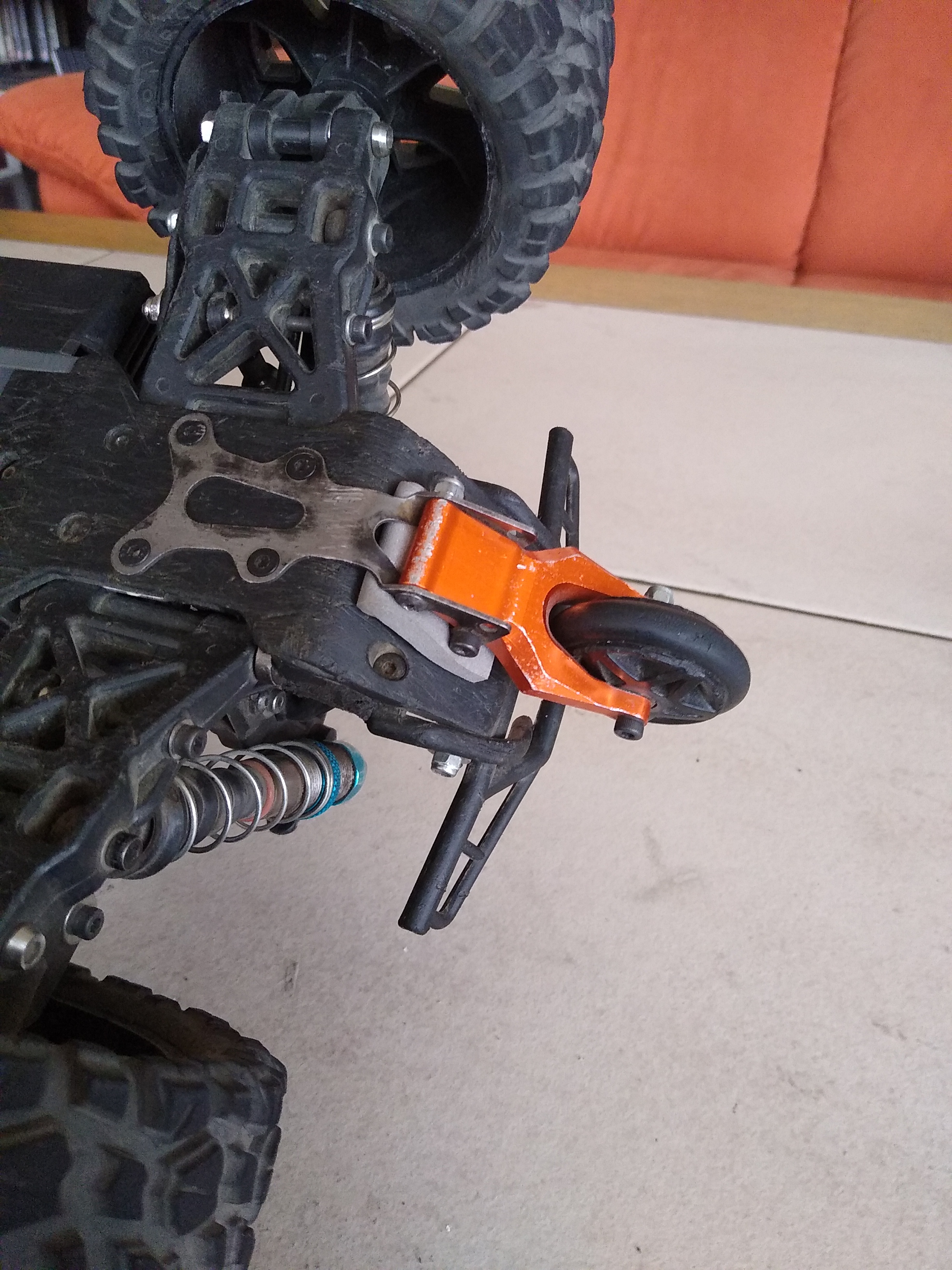 Die beiden unteren Arme der HPI WheelyBar hab ich einfach nur möglichst lang abgeschnitten, und die Reste mit unter die Stoßstange geklemmt.