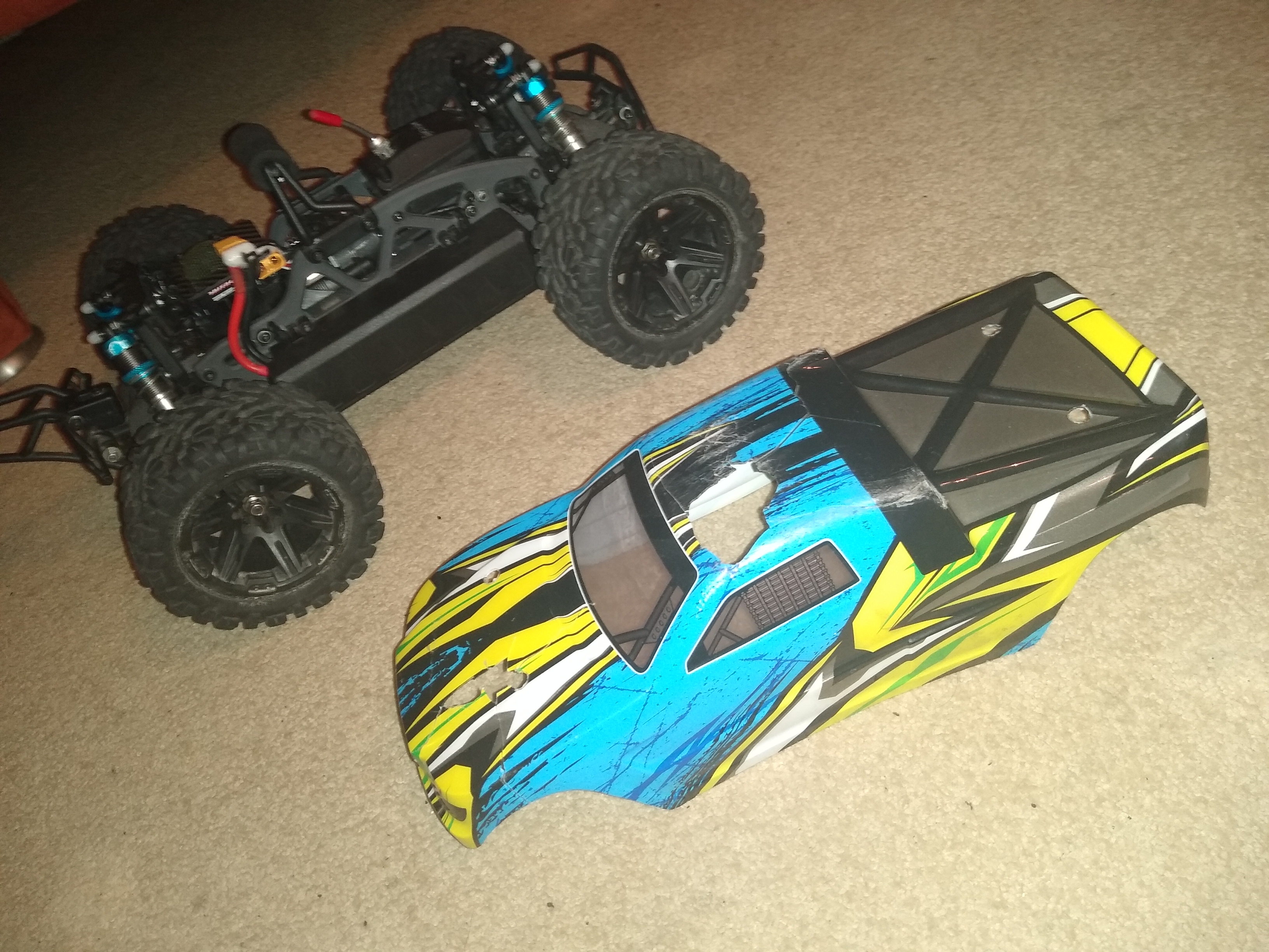 Von WL Toys gibts auch nen kleinen Monstertruck 104009 glaube ich heißt der und von Amewi habe ich auch einen Karo für den "AMEWI Monster Truck Body Green Truggy 1:12 HBX / 002-12081" gefunden.Ansonsten mit Gewebeband und dauerelastischem Kleber verstärken.