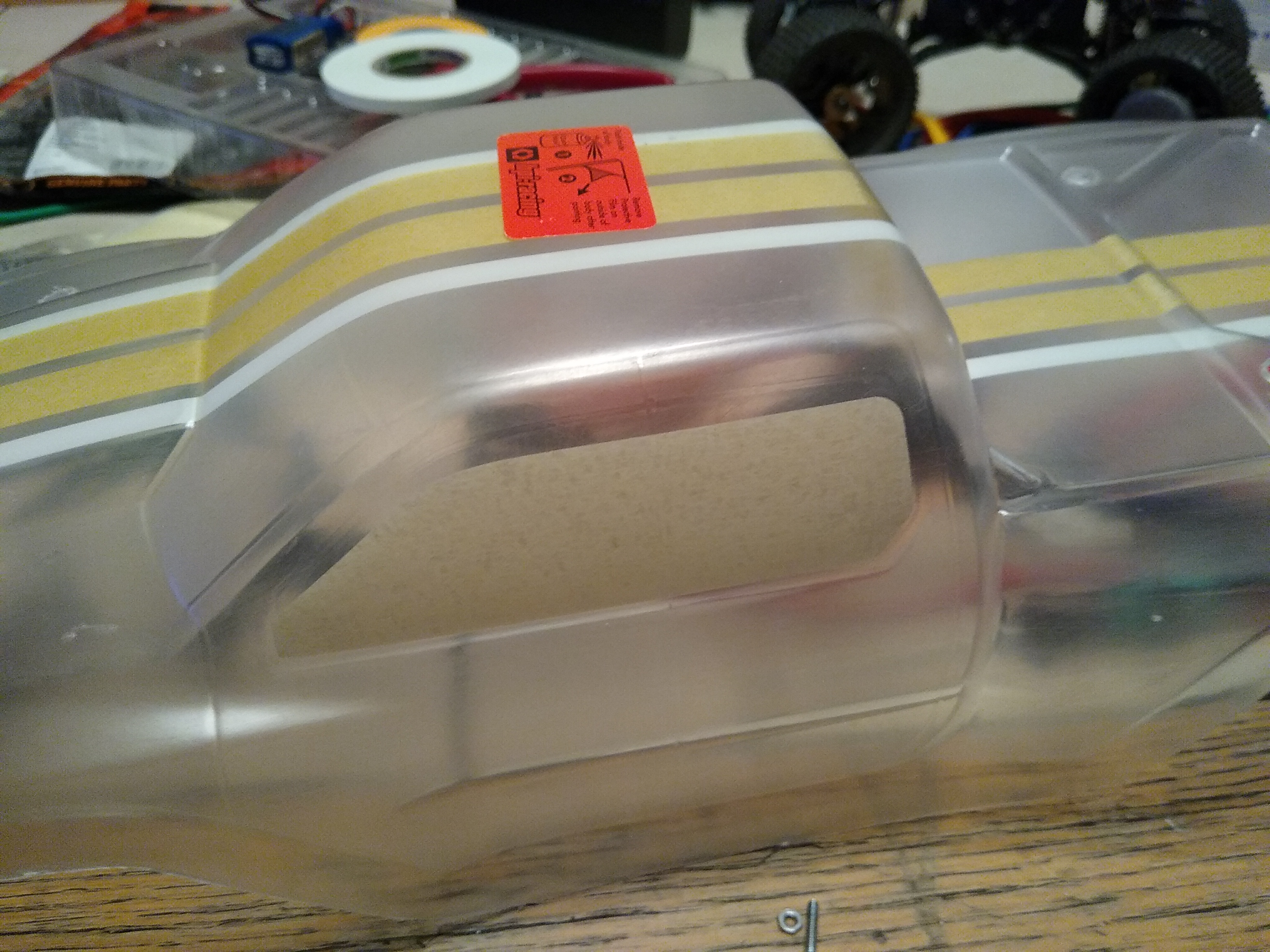Ich habe heute Mal etwas mit dem MaskierKlebeband in der HPI Karo geübt. Ist ja echt nicht so einfach, selbst wenn man nur gerade Linien markieren will, ohne das "Luftblasen" in den Knicken entstehen. Leider mußte ich auch gleich feststellen, das die bei der Karo dabei liegenden Maskierfolien für die Fenster zu klein sind.