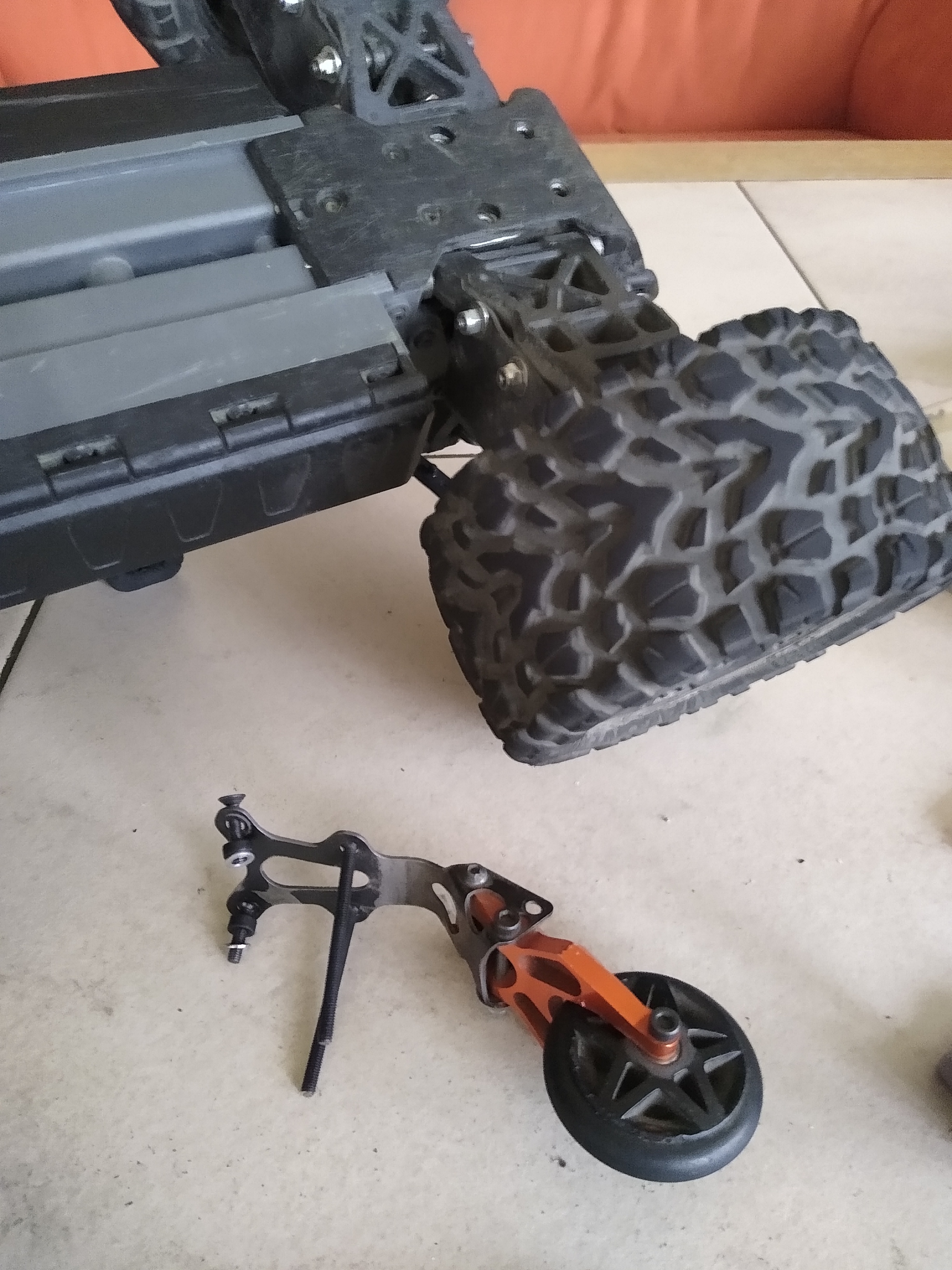 Heute hab ich mal die originale HPI WheelyBar etwas abgesenkt, damit sich das Chassie nicht mehr über 45° aufstellen kann, und somit beim wheelen kontrollierbarer bleibt. Dafür war eigentlich nur ein größerer oberer Befestigungsblock an der WheelyBar nötig.
