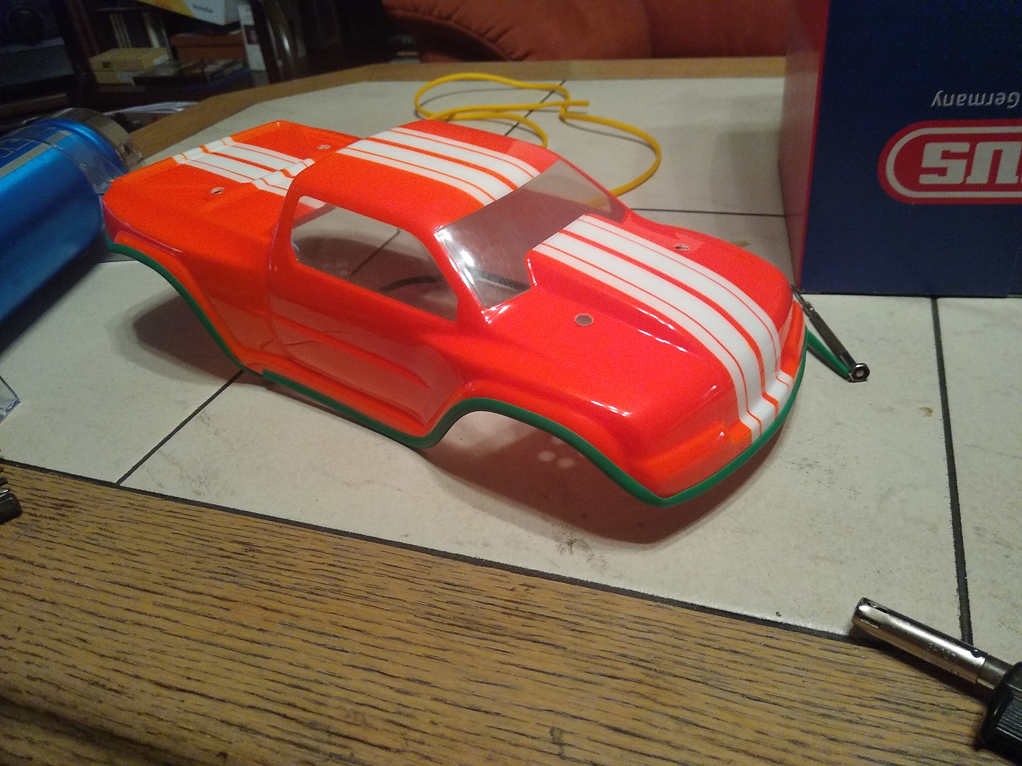 Jetzt hab ich mir erstmal wieder so ne originale HPI GT-2xs Karo gekauft. Die sind vom Material her eigentlich sehr gut, und von der Ausformung her auch fast perfekt( schöne viele große Rundungen). Aber leider ist sie auch etwas zu breit, so das meine breiteren Reifen gern Mal an der Karo schleifen.