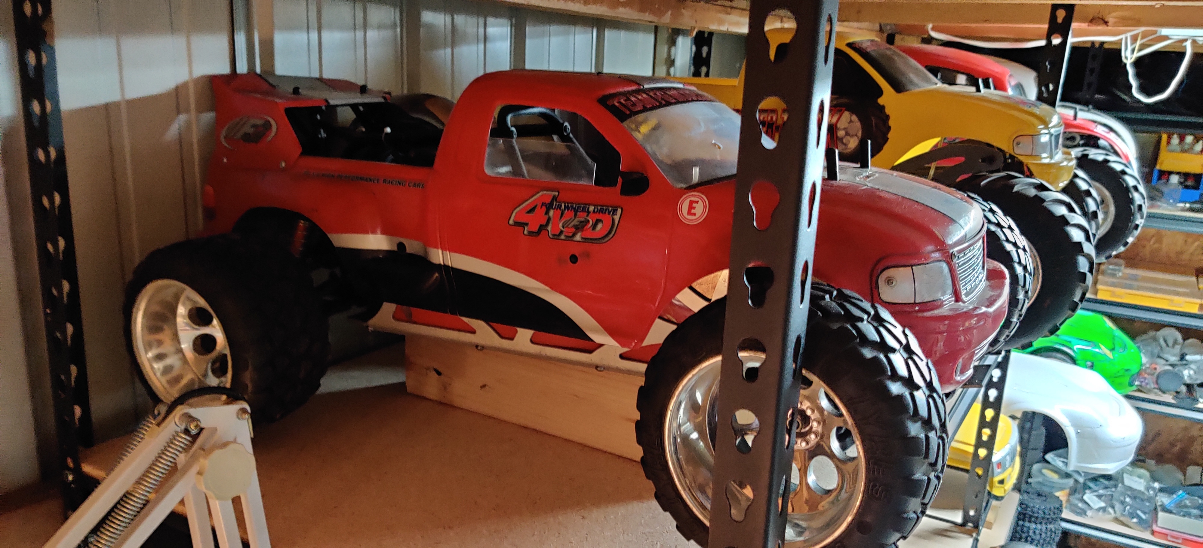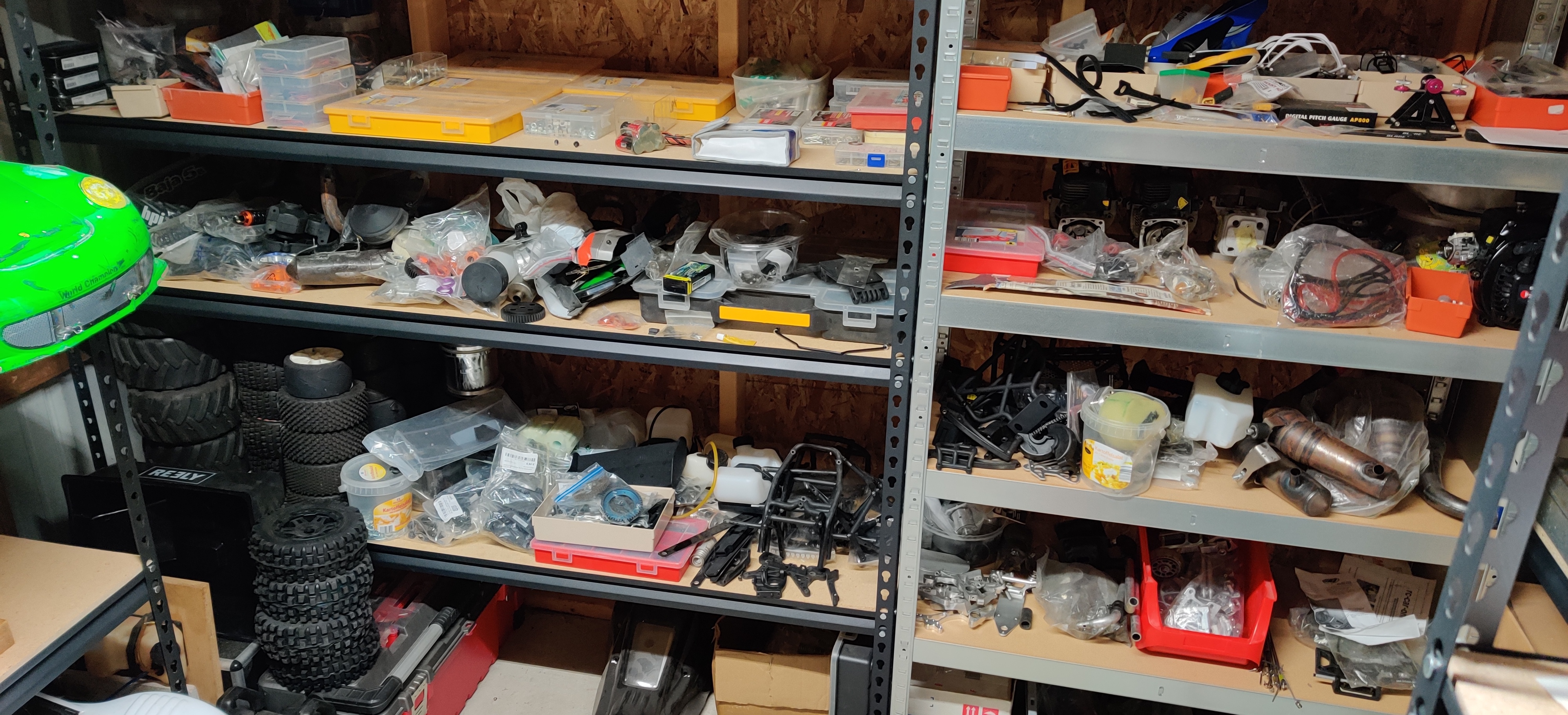 In meiner Hobbyhalle habe ich mir im hinteren Bereich eine kleine Ecke fuer die RC Modelle eingerichtet, irgendwie fehlt es einem ja immer an Platz, deswegen ist das alles ein wenig rein gequetscht.