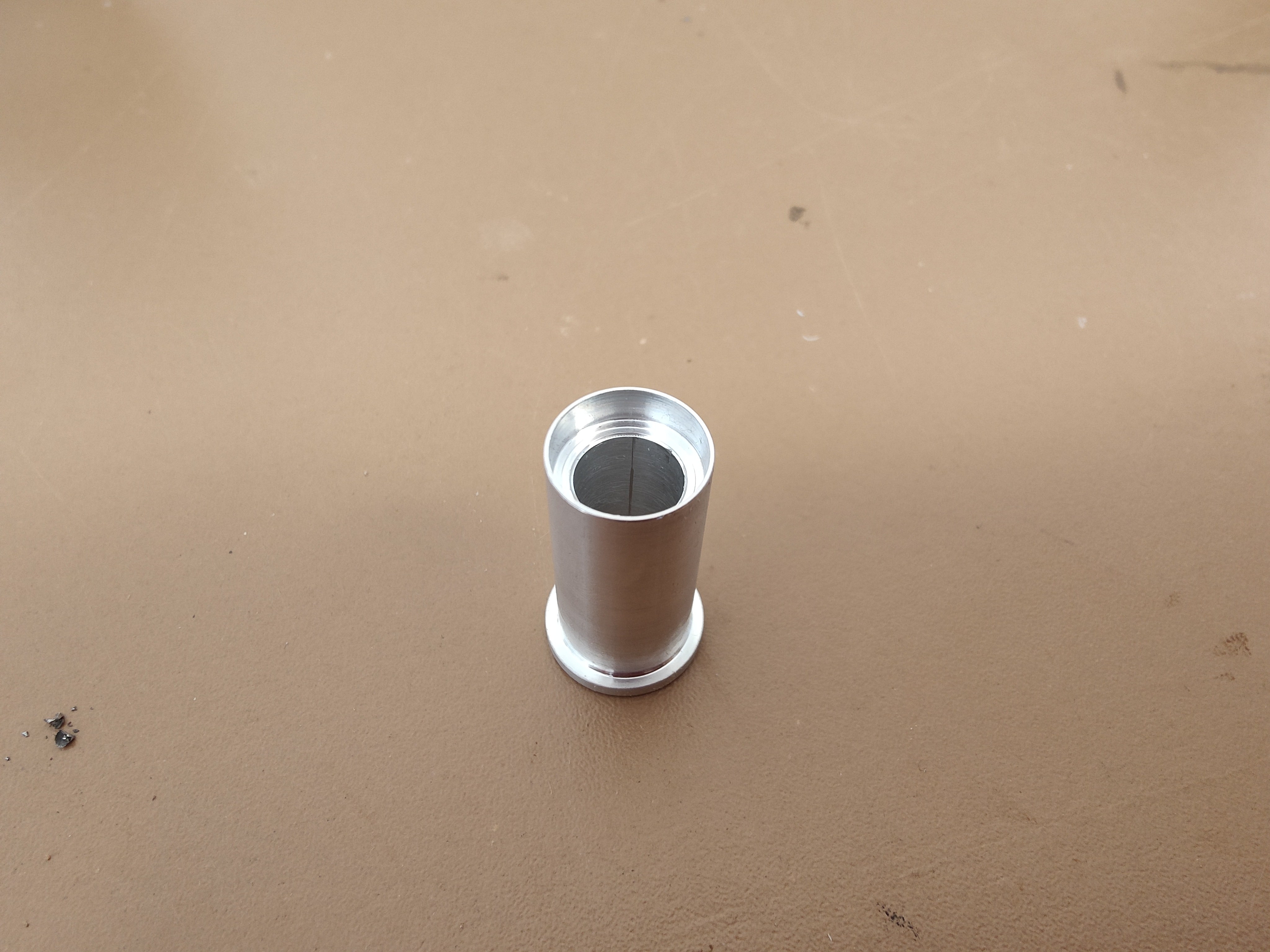 Um dies zu verhindern, also noch mal schnell an die Drehbank und einen Spacer-Ring gedreht - gerade einmal 0,5mm hoch. Der Außendurchmesser liegt bei ca. 20mm, innen 15,1. Bei diesem Teil kommt es (bis auf die Höhe) auf nichts an.So kann das Teil auf die Hohlwelle geschoben werden...