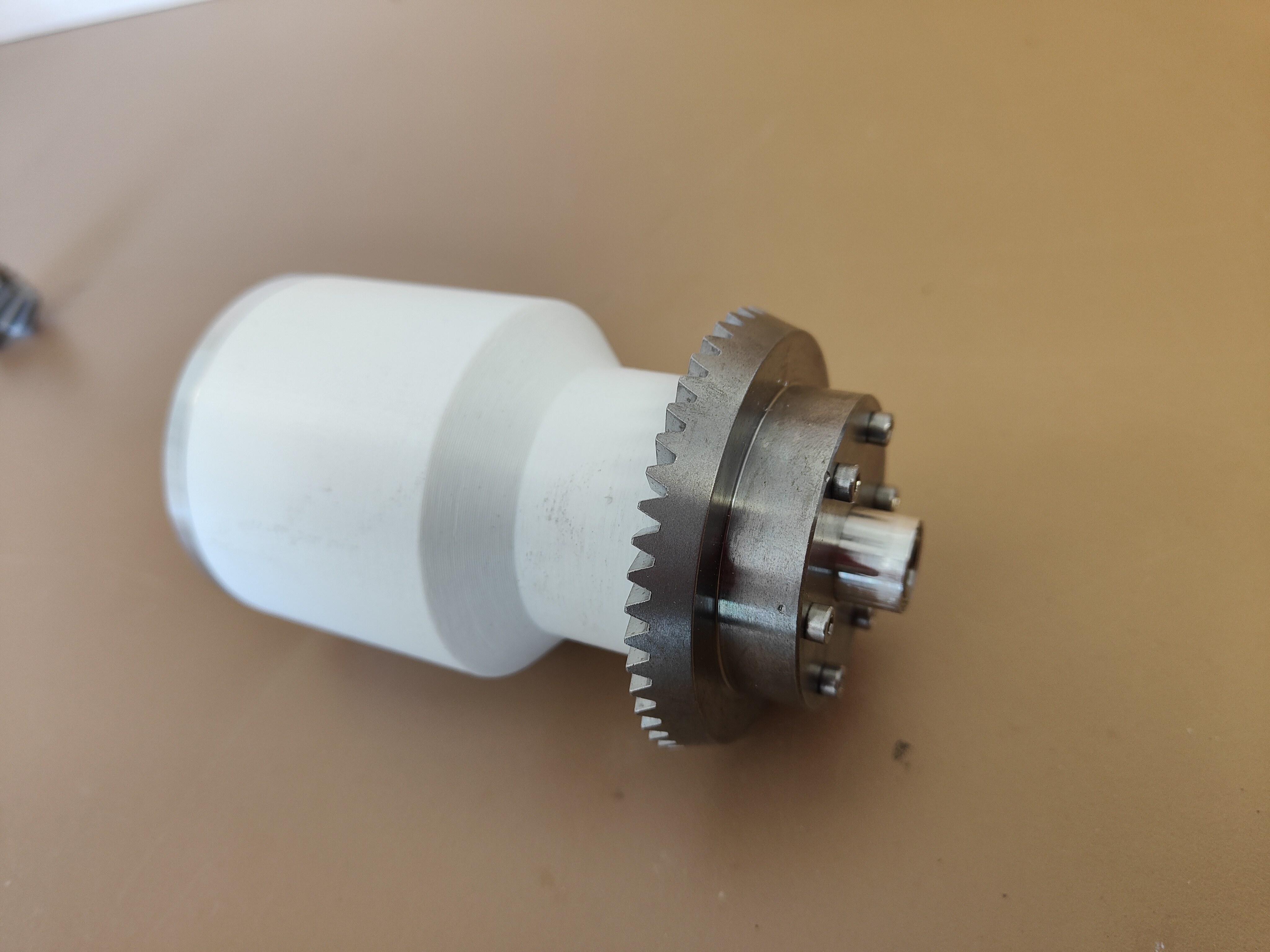 Während auf der Seite mit dem Deckel bereits alle Abstände fertig aufgedreht werden konnten, war dies bei der Buchse auf der Tellerradseite nicht möglich. Die Buchse musste von der Zahnseite zur Rückseite durch die Bohrung geschoben werden. Das Problem, welches sich dabei ergab, war ein am Tellerrad schleifender Kugellagerkranz.