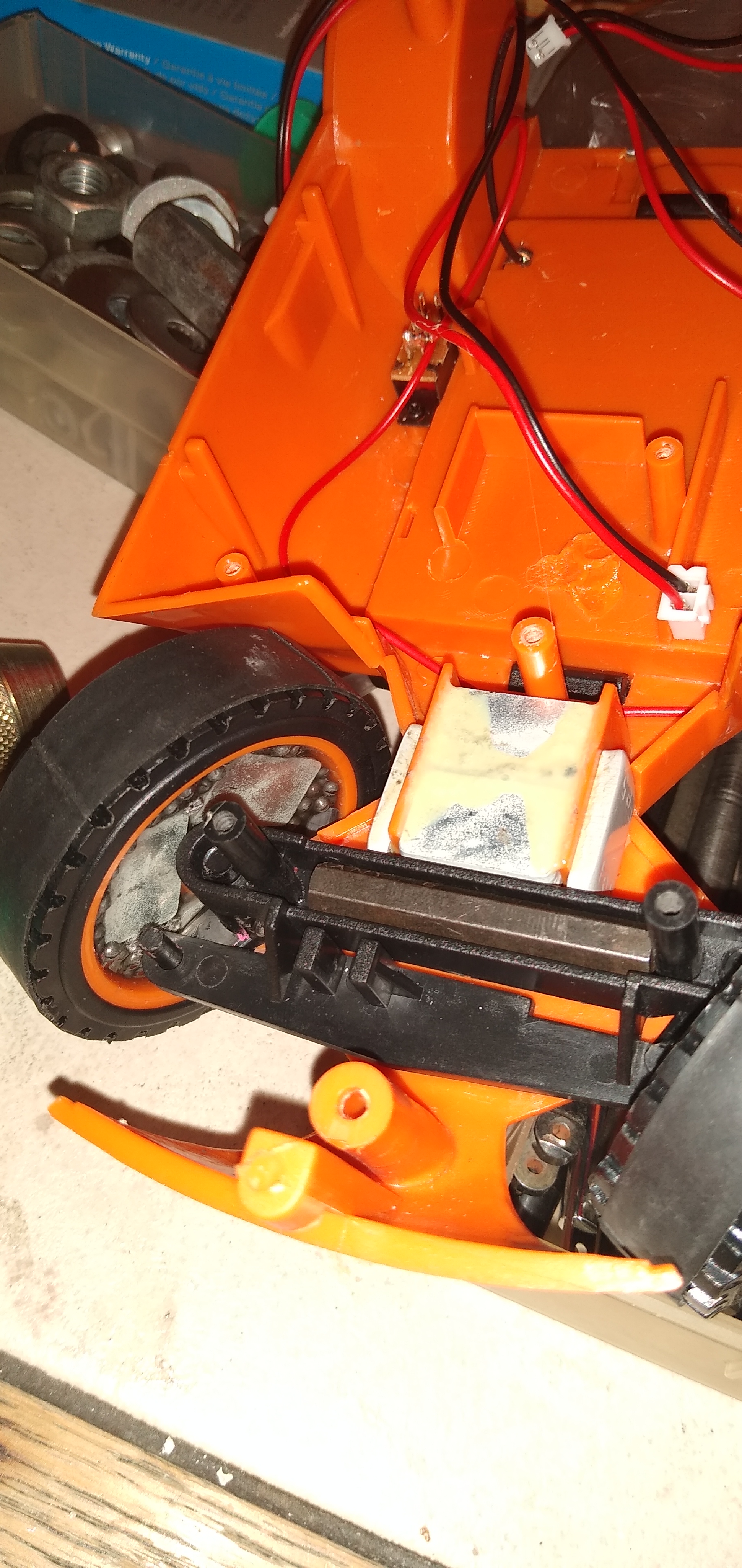 Als erstes hab ich mich Mal mit der gelenkten Hinterachse beschäftigt. Richtige Stapler haben am Heck eine gelenkte Pendelachse. Der Umbau auf ne richtige Pendelachse war mir aber zu aufwändig. Daher hab mich erstmal auf die Gewichtsverteilung konzentriert. Manche kleben einfach ein paar Gewichte auf und unter das Heck. Aber das sieht mMn ganz schön häslig aus. Daher hab ich die Hinterradfelgen beschwert, und auch noch ein paar Gramm unter dem Lenkservo verstaut, um mehr Gewicht auf die Hinterachse zu bekommen. Bei der Gelegenheit haben die Hinterachsfelgen auch richtige Gleitlager bekommen, und passende Schraubachsen in den Lenkblöcken eingeklebt.