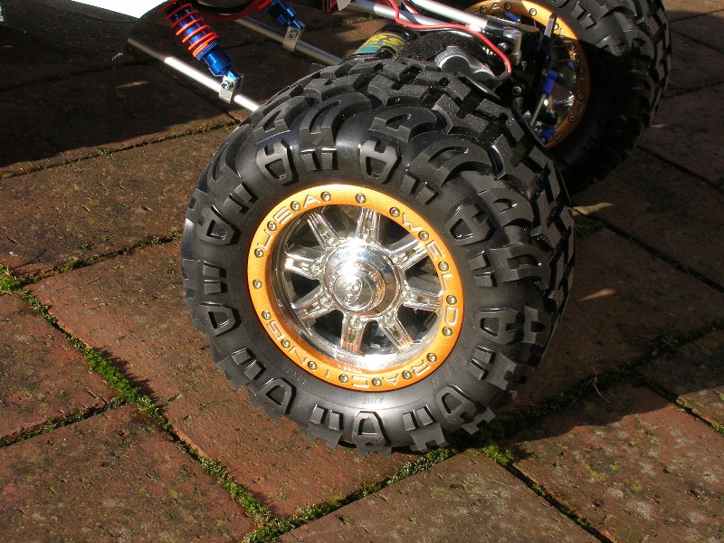 Gestern kamen endlich meine Felgen für mein Crawler.Hab mich gester Abend dann gleich mal dran gemacht meine Reifen mit 144(!!!) Schrauben an den Felgen zu befestigen.Heute hab ich dann alles an mein Crawler gebaut und bin recht zufrieden.Leider ist der Lenkeinschlag immernoch nicht zufriedenstellend,da muss ich noch was machen.