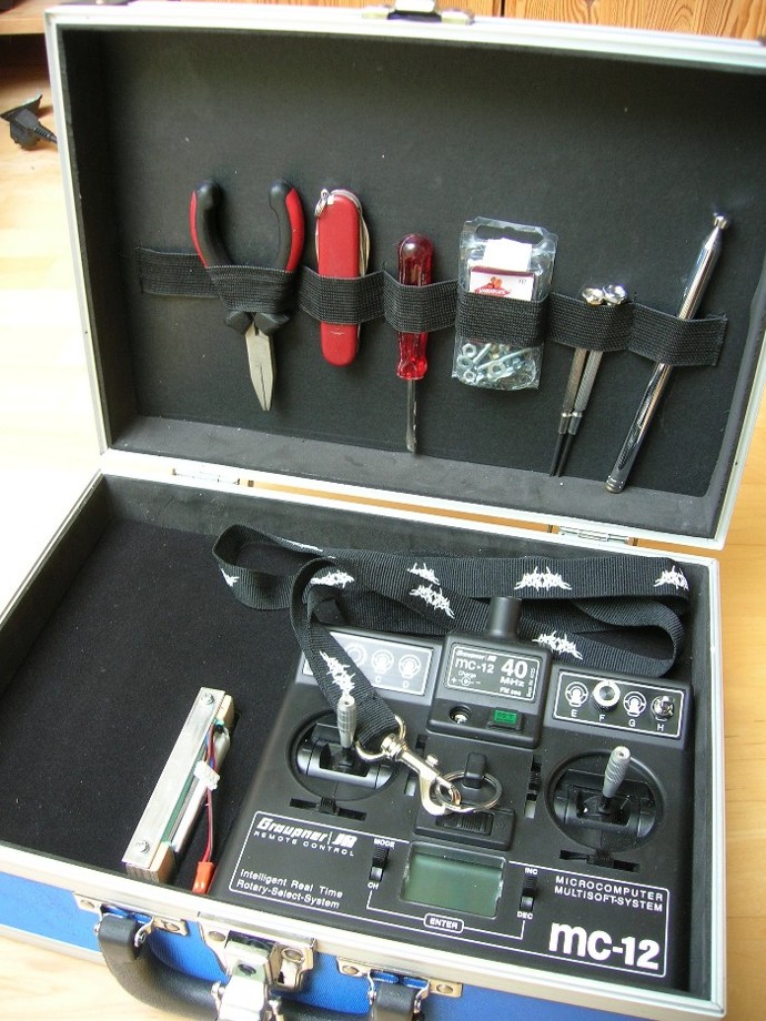 War heute im Baumarkt und hab mir nen kleinen Alukoffer für 12,95€ geholt.Dazu noch eine 40mm starke Styroporplatte für 1,34€.Daraus ist ein kleiner RC-Koffer entstanden.