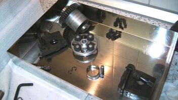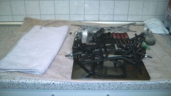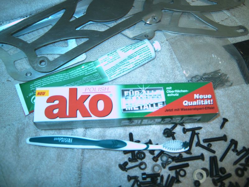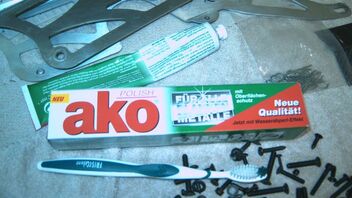also heut gibs nur schleppend weiter... hinten si alles auseinandergebaut, geeputzt und mit Kunnsttoff reiniger versiegelt. Des weiteren ist die Bremsplatte oder wie die nochmal heißt weggeschmolzen, die Bremsbeläge und die Bremsscheiben am ende^^. Hyrdobremse wird es wenn die RHW für vorne... Morgen geht die bestellung für die Teile raus. Evtl. bekomme ich zum Geb. die hinteren teile geschenkt... wäre cool hehe. Motor ist gereinigt (nur von außen) voher nacher könnt ihr ja angucken. TVP`s werden Poliert... ich hoff ich bekomme bei denen auhc n so gutes Ergebnis zustande....^^ übrigenz ich hab mal n Bild von der Paste gemacht... ich kann sie euch ans Herz legen. Kostet glaub cih 2.50€ und is echt gut. Hab heute mal noch n ordentliches Bild von vorne gemacht. und s letzte bild is mein arbeitsplatz wie er momentan ist...