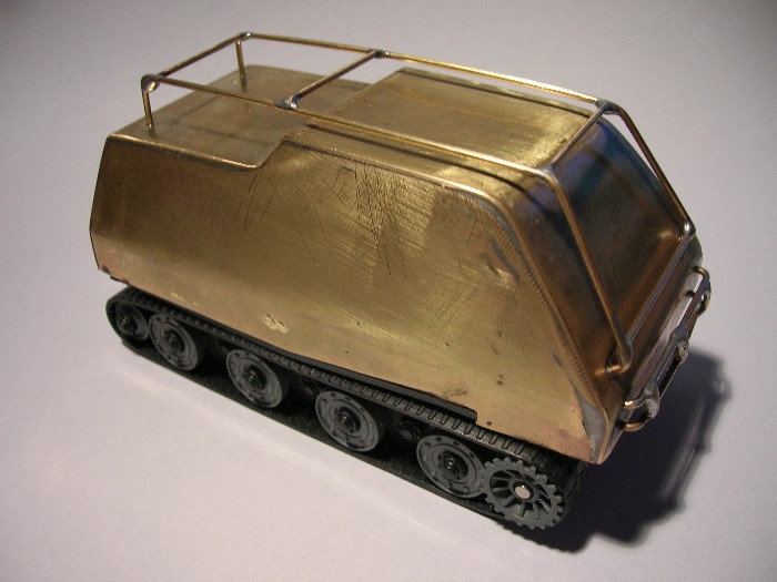 Was habe ich geändert: Den kompletten Aufbau des Panzers abgebaut so dass nur noch das Chassi mit Ketten und Elektronik da stand.Dann viel sägen,feilen,biegen,bohren,löten und die grobe Karosse steht da(mit allen Neuanfängen und Verbesserungen ca.5h).Danach alle kanten schön rundfeilen und dann nochma mit Schleifpapier drüber.Wer sich gerne beim Bastel die Finger bricht und am liebsten mit Lupe arbeitet(so wie ich) der baut dann noch nen kleinen Überrollbügel drauf und vorneran noch ne kleine Stoßstange.Wieder alles schön verschleifen und noch ne Befestigungsmöglichkeit ans Chassi ranbauen - fertig.