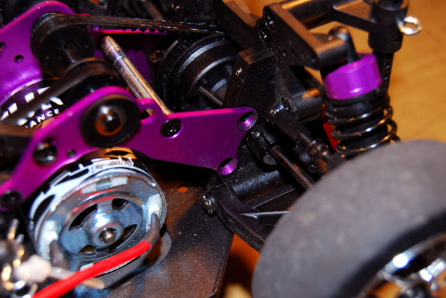 Dann habe ich von anfang an schonmal das größere HZ reingebaut (92 Zähne), um mehr Power zu bekommen. Dann den Permax wieder durch die HPI Saturn Motor ersetzt und dann habe ich mir noch ganz schnell eine Akkuhalterung für die andere Seite gebaut, habe also jetzt links und rechts meine coolen Alu Halterungen :thumbup: Glücklicher Weise passt die Karo immernoch gut drüber :super: