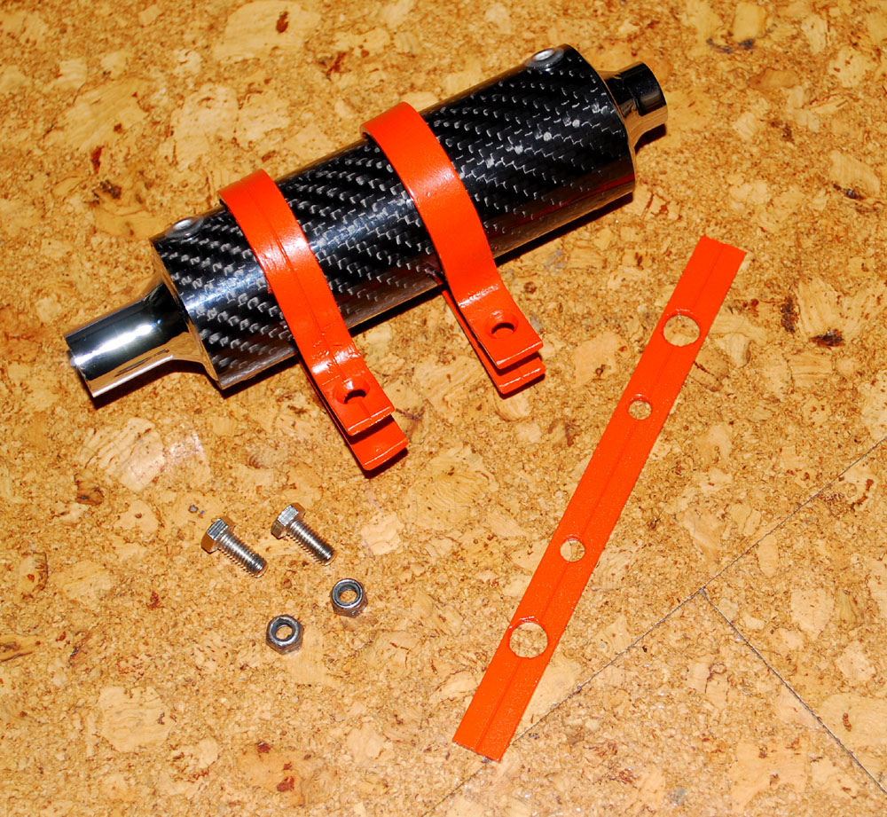 So, für den Heck Dom hab ich da schonmal was vorbereitet: Die Halterung für den DDM Silencer. Inspiriert vom BLUR Produkt und dann frei umgesetzt mit nem Streifen Alu, den ich zugeschnitten, gebogen, gebohrt und lackiert hab.