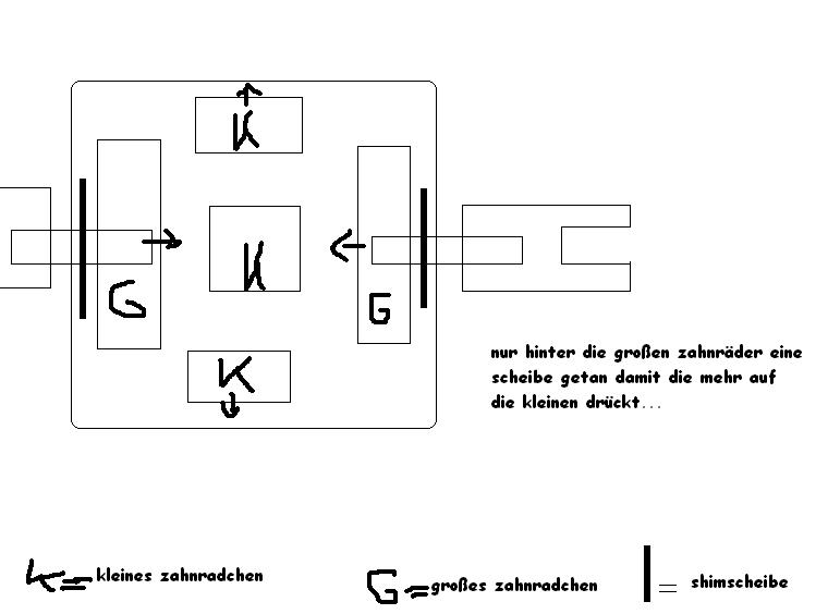 Bei den Diffs ist es genauso. Du legst die kleinen Scheibchen zwischen die Zahnräder und somit verringert sich das Spiel zwischen den Zahnrädchen.