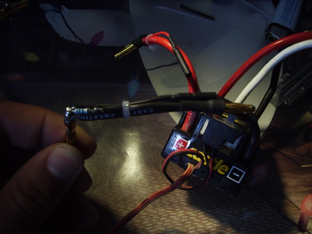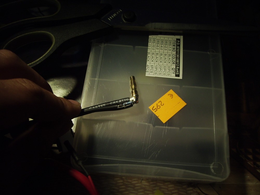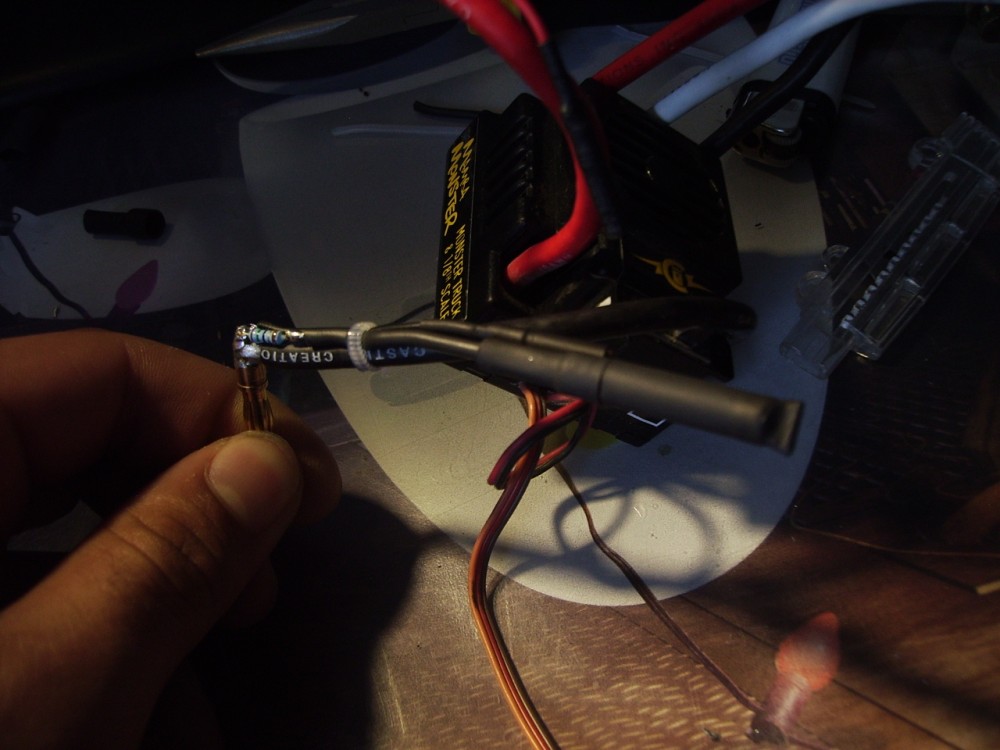 Nicht mal ein mini-Fünkchen mehr. Ist denk ich auch für die Akkus besser!! Damit der während des Betriebs offene Kontakt keinen Schaden anrichtet, einfach ne isolierte Buchse drüber...aber seht selbst:Offener gefährlicher Kontakt. Nachdem alles verbunden ist (bis auf die schwarze Akku-Leitung des Regler!!!) muss dieser eingesteckt werden. Kurz warten bis die Kondensatoren geladen sind (ich merke das weil dann meine Motorlüfter anspringen, dauert nur 2 Sekündchen) und dann die normale Akkuleitung einstecken.