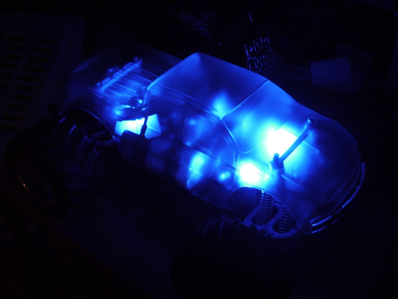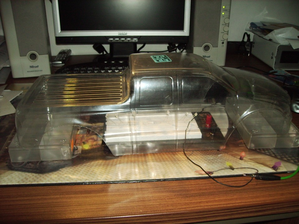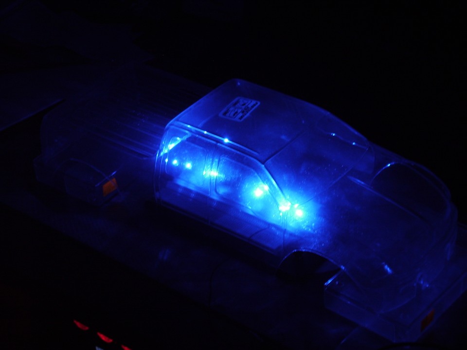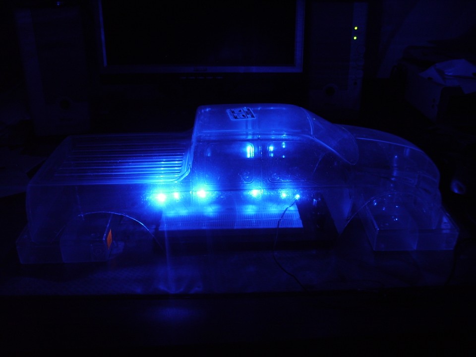 Wie wäre es denn wenn du die Karo einfarbig Metallic-Balu lackierst und vorne und hinten Leds reinmachst in die Lampen, ist einfach zu machen und sieht bestimmt sehr schön aus, mir Persönlich würde das besser gefallen als die durchsichtige Karo und die blauen Leds und ein RIESEN große Nachteil ist, wenn du im Dreck fährst sieht man den Dreck der von unten in die Karo kommt auch außen