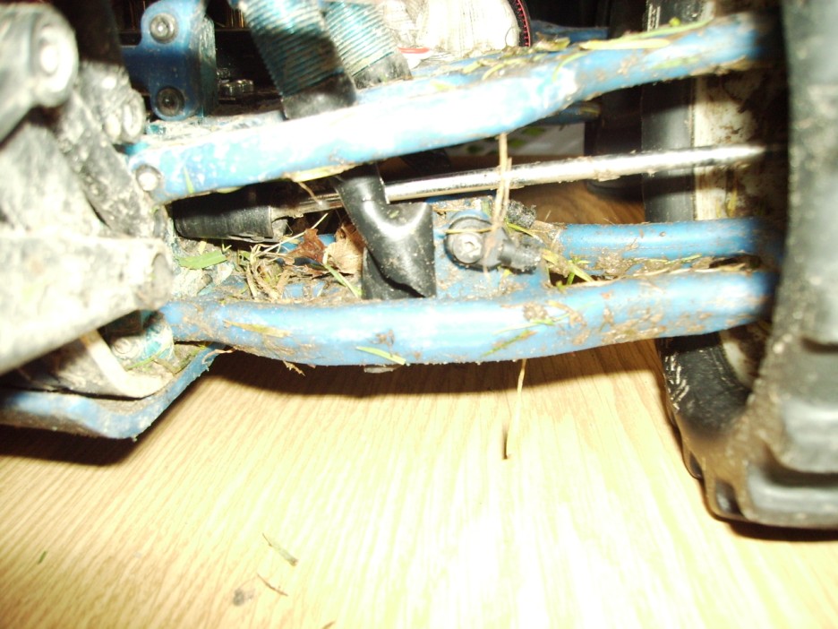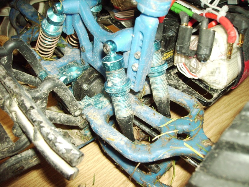 Dann bin ich einmal über so ne Skater-Rampe gefahren. Die Rampe war ca. 50-60cm hoch. Der Maxx war 20cm über der Rampe, ist nur noch halb auf der Rampe aufgekommen und dann die Rampe runtergeplumst und auf den Rücken gelandet. Bei dem halben Meter passiert schon nix...falsch...2 hintere Dämpfer hats erwischt (links und rechts). Beim einen ist der Stift aus dem Platik der Kugelpfanne raus, beim anderen ist das Plastik der Kugelpfanne abgerissen.