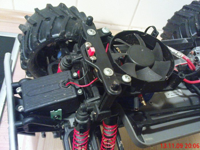 Nun ist ein neuer drin und alles läuft top..Habe die ganzen Stecksysteme gegen Goldstecker ausgetauscht.Zugunsten der Hitzeentwicklung am Akku,Regler und Motor habe ich einen großen Lüfter verbaut den ich mit einer 9V Block Batterie betreibe und der extra geschaltet ist.In der Karosserie habe ich ein paar Lüfterschlitze,wo der Lüfter ansaugt und großräumig über alles drüberbläst..An die Karosserieklemmen habe ich kleine Ringe befestigt zum besser greifen..