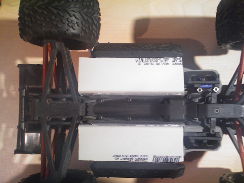 Mit den 2 Stück 2400er Kokam Lipos parallel geschaltet, haben ordentlich Power, und durch den nach hinten verlagerten Schwerpunkt ne geile Wheeliefähigkeit. Durch das höhere Dewicht bekommt der kleine eine viel bessere Lage auf der Straße, auch wenn die Standardfedern und Dämpfer viel zu weich sind. Ich muss die Federn so weit zusammenschrauben, so dass kaum Federweg da ist. Neue Federn und Dämpfer sind bestellt und sollten eigentlich heute geliefert werden.