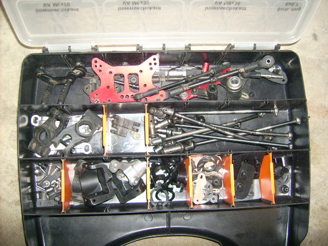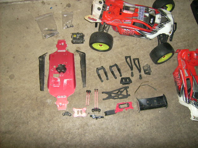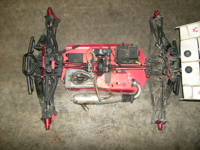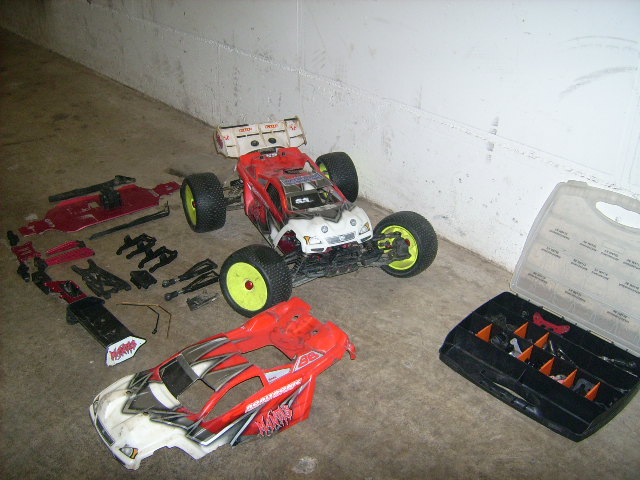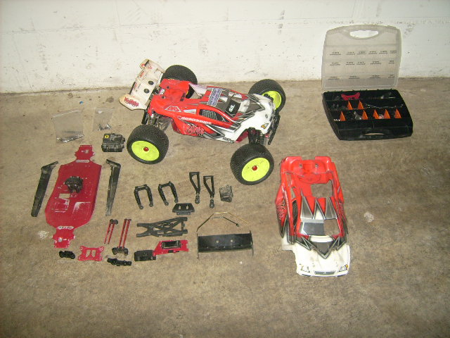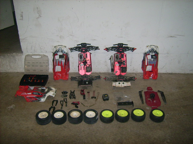 in Schuss. Es ist fast alles an Alu-Upgrade verbaut, was man für den Mantis bekommt. Dabei ist auch noch ein Original Robitronic Reso und Krümmer. Als Bereifung habe ich die GRP Reifen drauf. Das Profil ist zwar nicht mehr so toll, aber zum bashen reicht es alle mal. Eine zweite Karosse lege ich auch noch dazu und jede Menge Ersatzteile, die ich jetzt nicht aufzählen will. Das würde zu lange dauern. Es ist alles dabei, was auf den Bildern zu sehen ist.