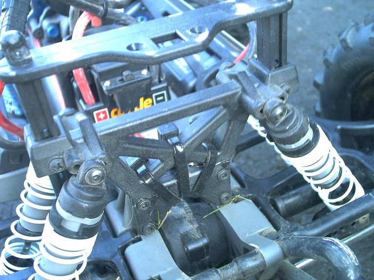 Eine Woche Später kam der erste Sprungtest auf einem Treffen. Alle wollten sehen was der neue alles kann. Zu nachst lief alles Problemlos. Bis zu dem Zeitpunkt als ich die Rampe etwas schief erwischte und der Maxx mit voller wucht auf dem Dach landete. Das Ergebnis war mir fast klar-> Hintere Dämpferbrücke war gebrochen! DAnk meiner Kollegen konnte wir den Maxx in einer Feldreparatur wieder Fahrbar machen. Bruchstelle mit Sekundenkleber eingeschmiert gut zusammen gedrückt und drei Kabelbinder drum. Fertig war das Provisorium und es hält seit 4 Wochen. Nur jetzt kommen auch endlich die Alu-Dämpferbrücken für vorne und hinten, denke mal nächste Woche.
