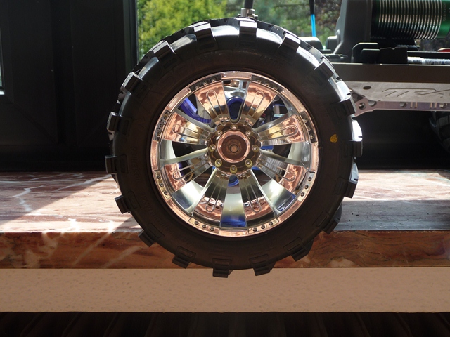 Die Felger sind axial 8 Spoke Oversize MT Wheels in Chrome. Als Reifen habe ich die Proline Masher 3.8 genommen.