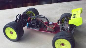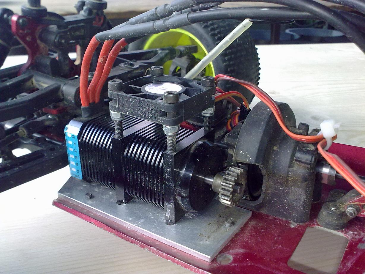 Der Motor ist vorne links, entgegen der Fahrtrichtung. Das Mitteldiff wurde dafür gedreht. Der Antriebsstarng wurde komplett zerleht und neu aufgebaut. Neue Difföle, Kugellager und etliche weh weh chen wurden repariert oder gleich ersetzt. Dann wurde die Lenkung überarbeitet das der Ausschlg größer wurde. Etliche andere Dinge wurden überarbeitet, sowie die Diffausgänge gekürzt das sich kein dreck mehr ansammeln kann und die Kugellager dadurch kaputt gehen. Der Regler sitzt an der position wo der Nitro ursprünglich mal platz nahm. Akku´s sind hinten rechts dafür wurde eine Klettband befestigung gebaut. Der Empfänger wurde auf dem Lenkservo platziert.